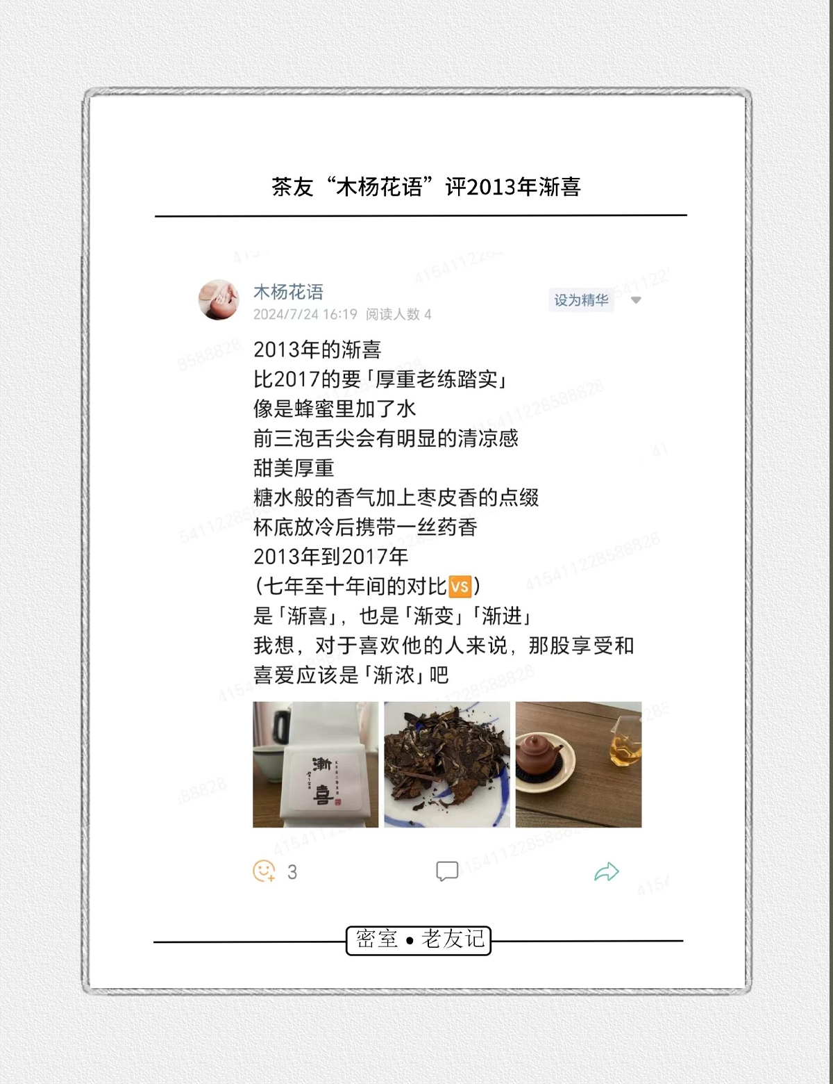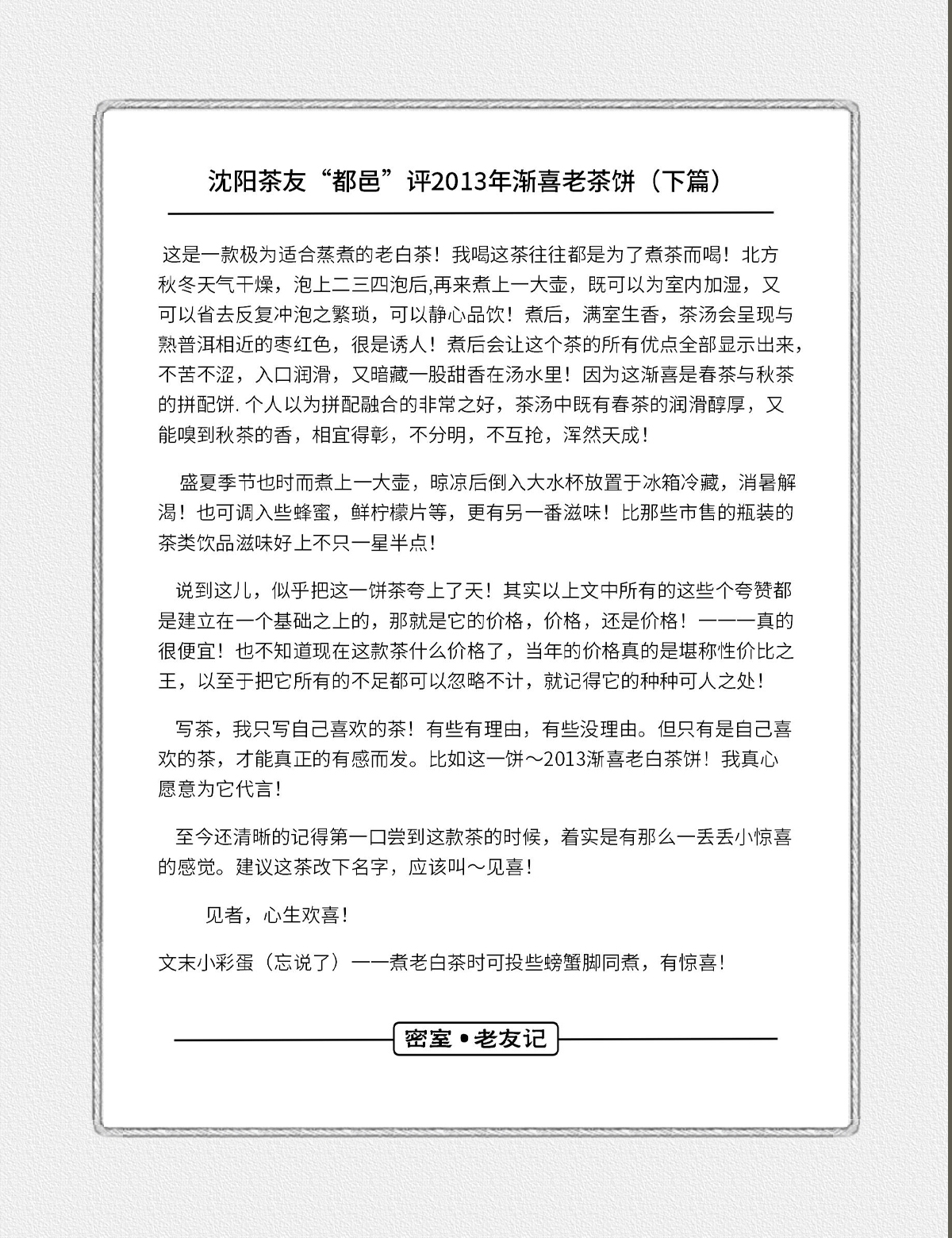- 2021年,嘉木会创办了“藏茶密室”,开启了全新的藏茶模式,秉持“不将就,不迎合”的理念,通过“选、藏、养、醒”的方式,再度诠释藏茶的深意,沉醉杯汤,苦乐自知,茗透于心,迷之不悔!