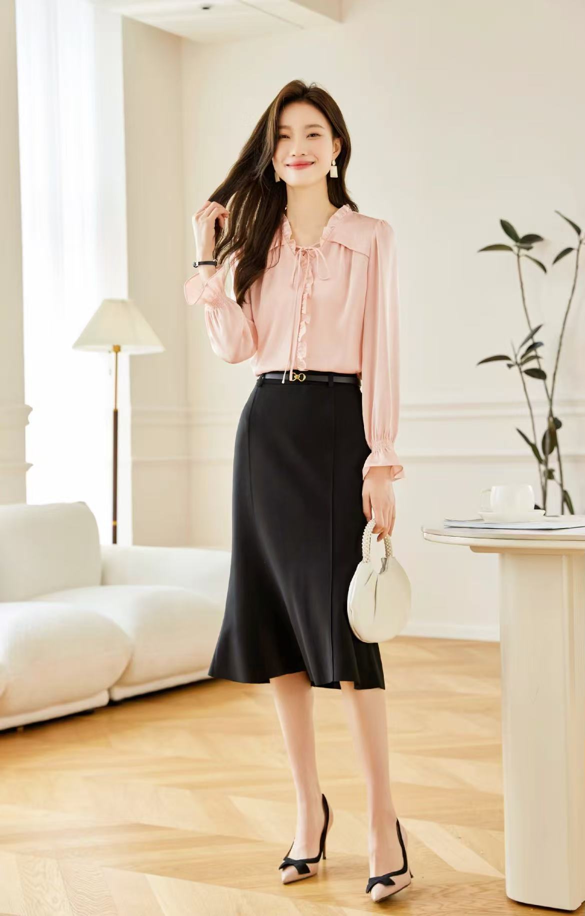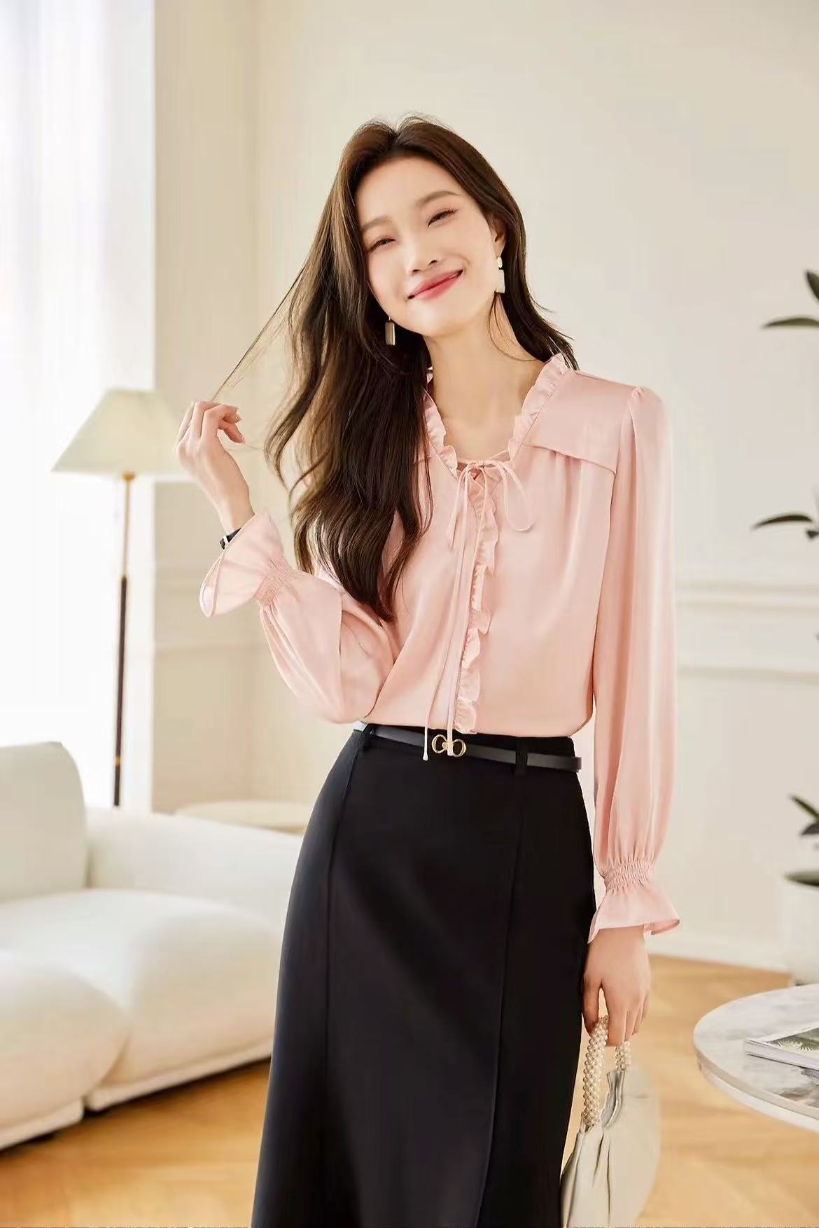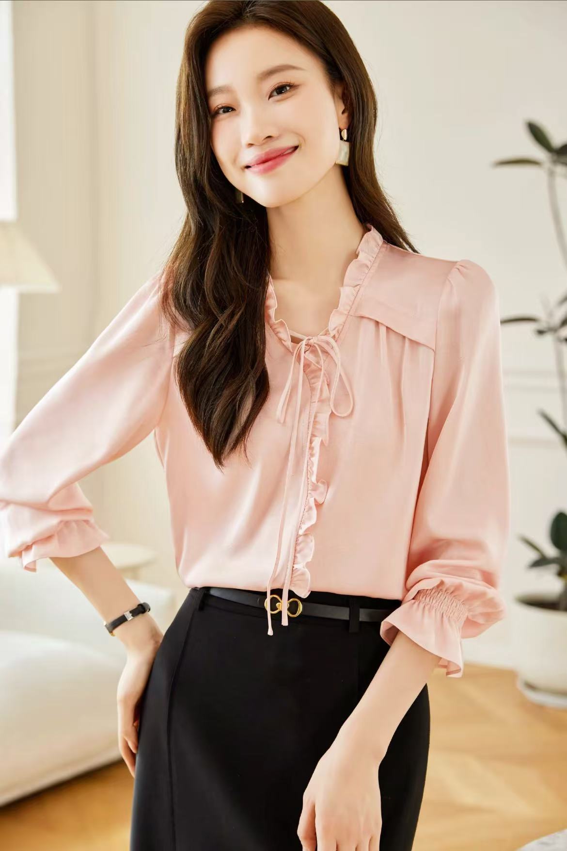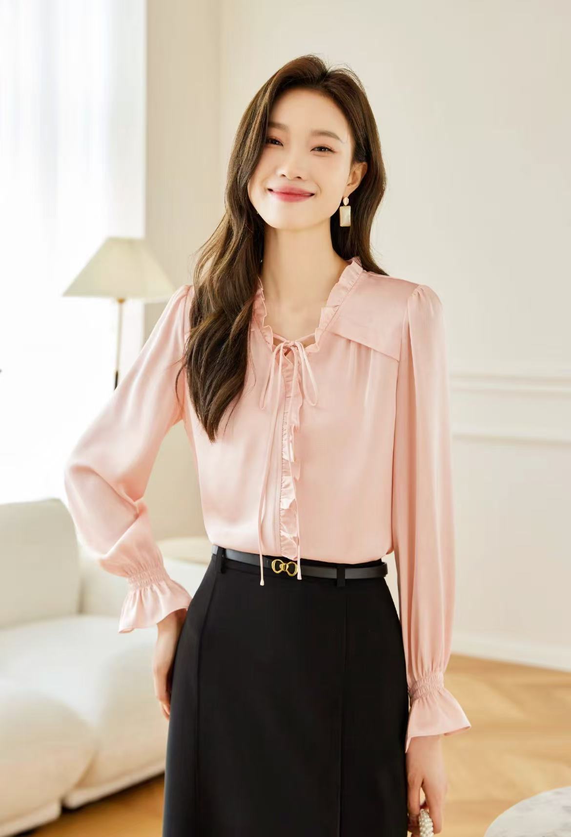 【新品推荐】瑟俪品牌-0502手抓纹木耳边仿真丝缎面顺滑长袖小衫-喜出