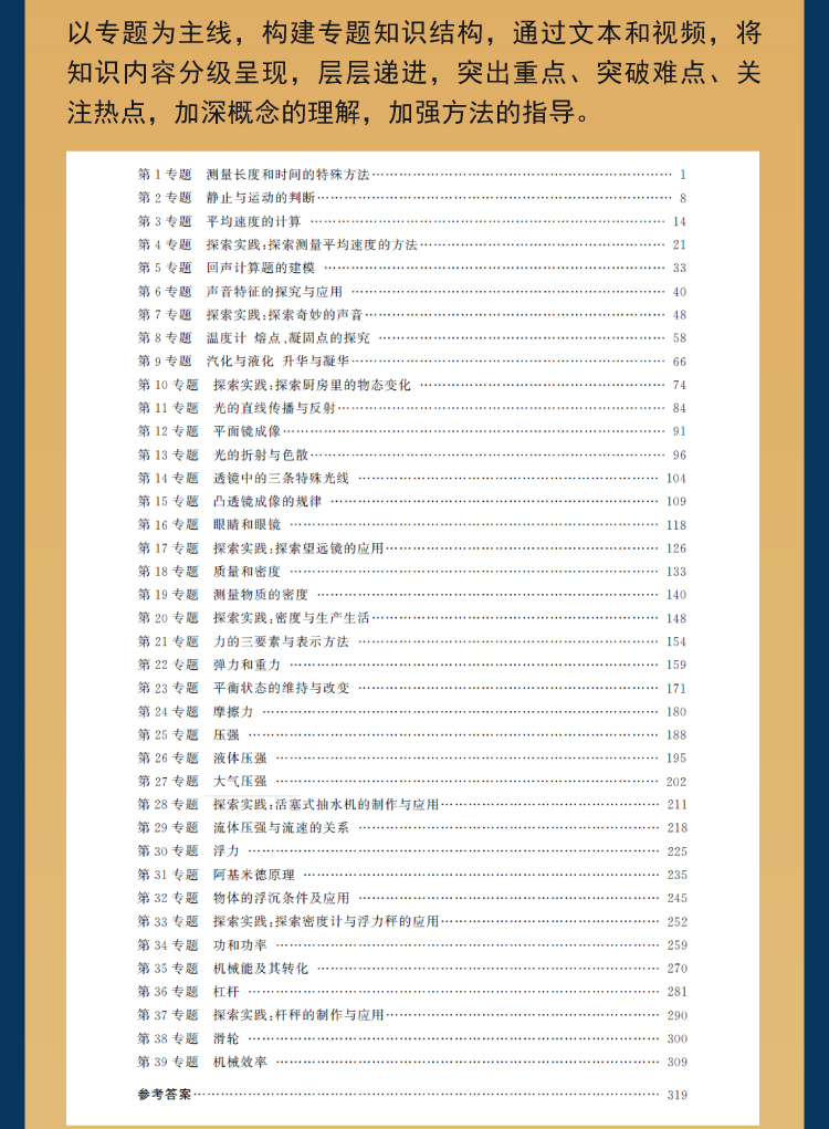 本套书共分为八年级,九年级2册,每册由20余个专题组成,每个专题可细分为图片引导、自我培优、自我评估、挑战一下四个部分。2套书共有40余个专题,内含380余个讲课视频,本套书通过文本视频的全方位结合,将初中物理知识内容分年级呈现,层层递进,突出重点、突破难点、关注热点,加深概念的理解,加强方法的指导,帮助学生更好地进行自主培优,并为学生的中考及之后的高中学习奠定基础。本册为初中物理自主培优新讲八年级分册。