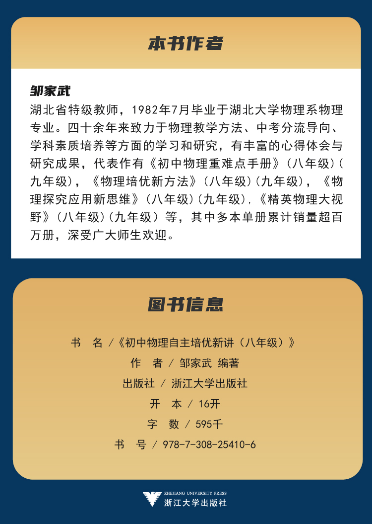 邹家武,男,湖北省特级教师,长期致力于物理教学方法、中考导向、物理竞赛的研究,有丰富的心得体会和研究成果。出版专著有《初中物理重难点手册》、《物理培优竞赛新方法》、《精英物理大视野》、《问道中考物理能力题》等