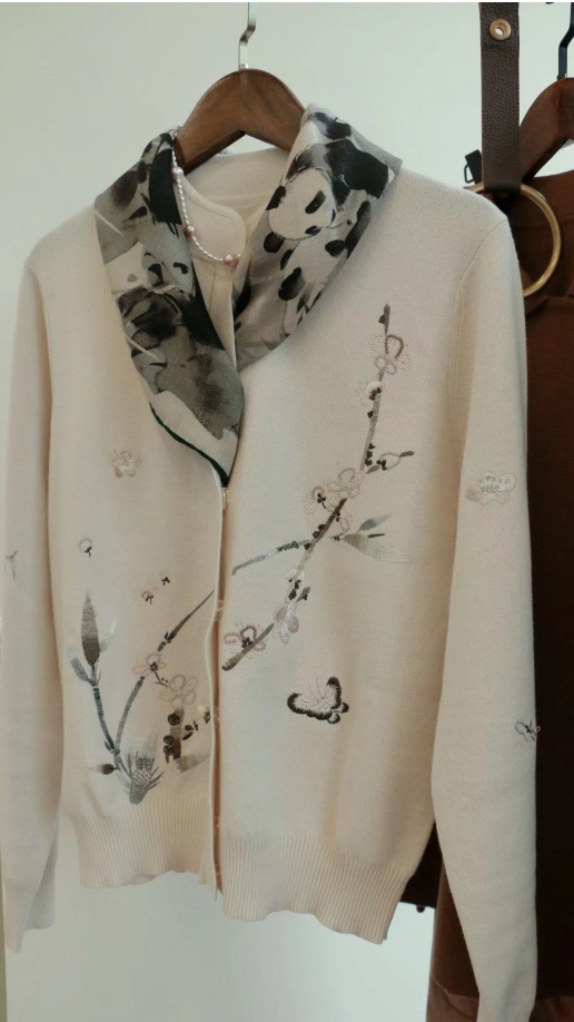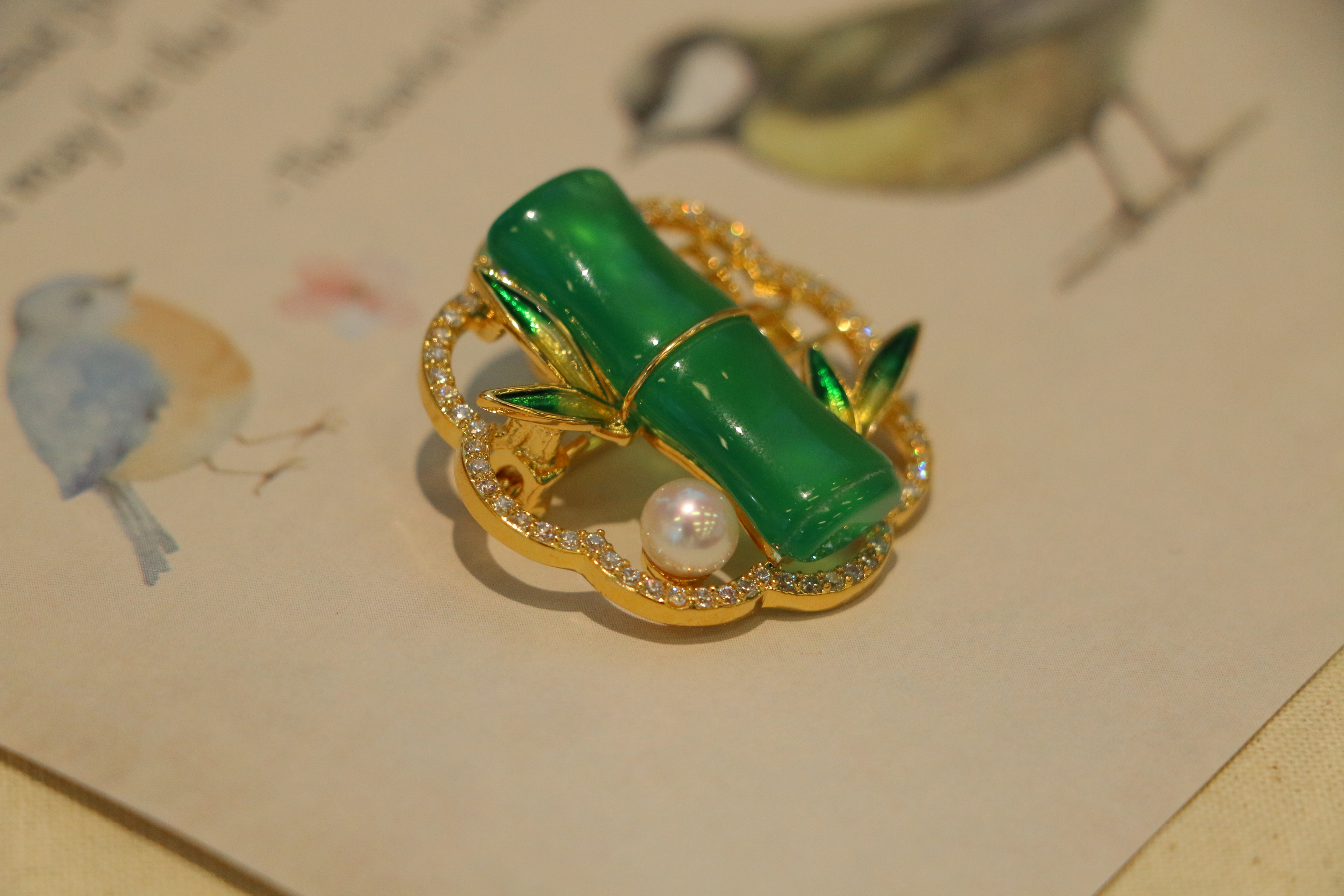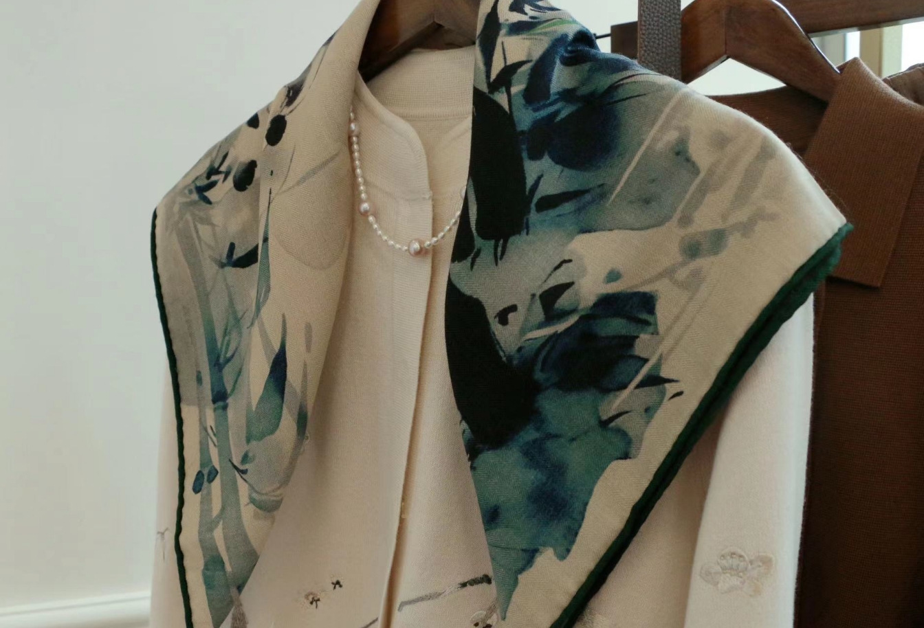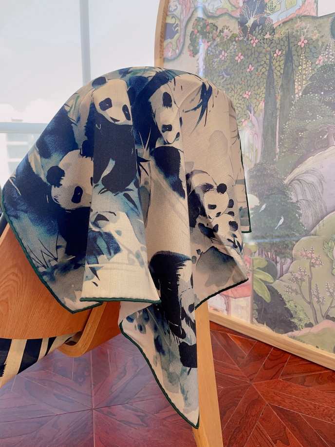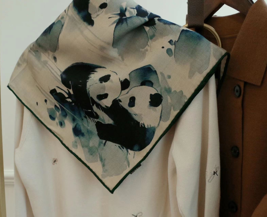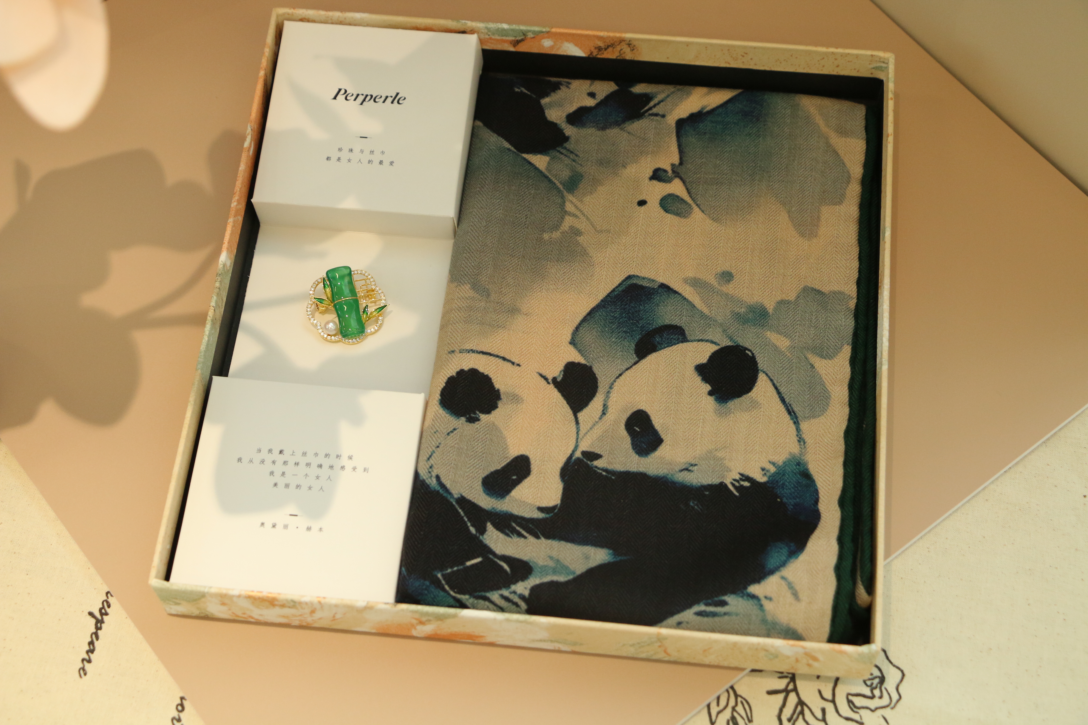 【甄珠贝·国风系列】70*70cm双面异色熊猫丝羊毛丝巾和天然淡水正圆绿竹胸花礼盒套装【适合送外宾】