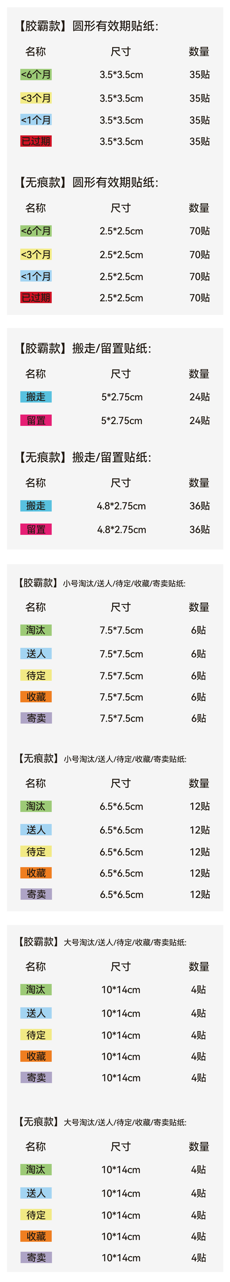 搬家贴纸 :有效期、留置、搬走、淘汰、送人、待定,收藏,寄卖共18款