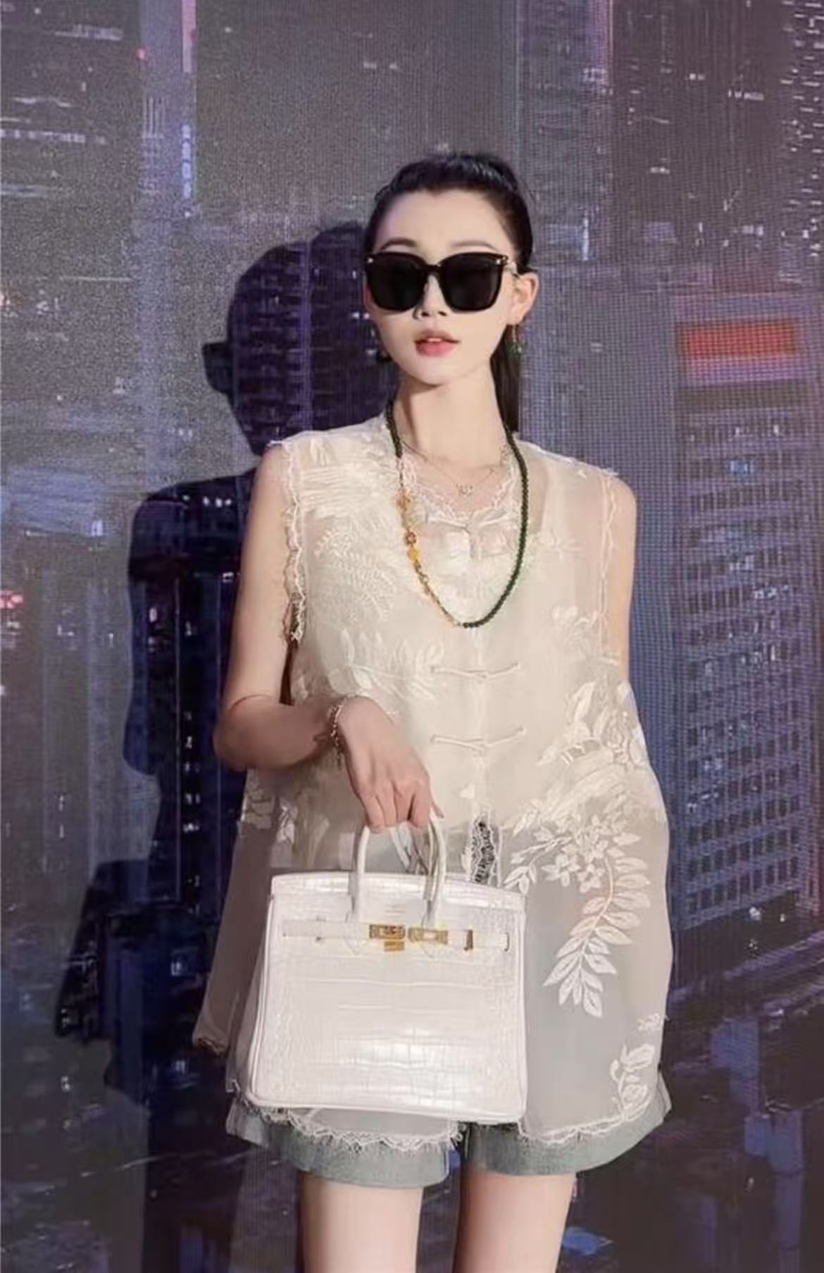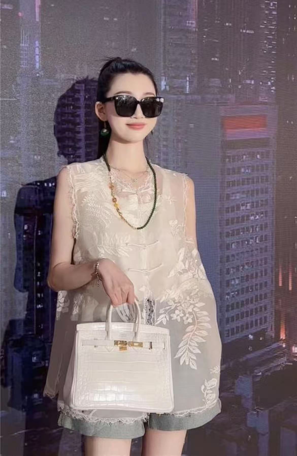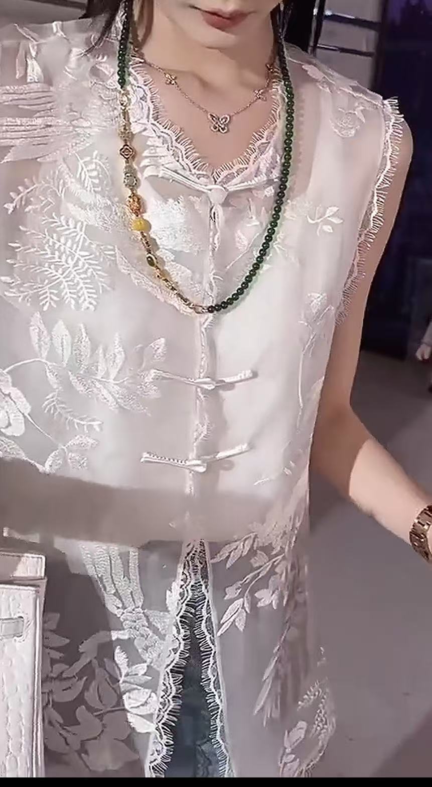 【MYBL】8899双层欧根纱超美新中式刺绣蕾丝边侧开叉马甲-喜出