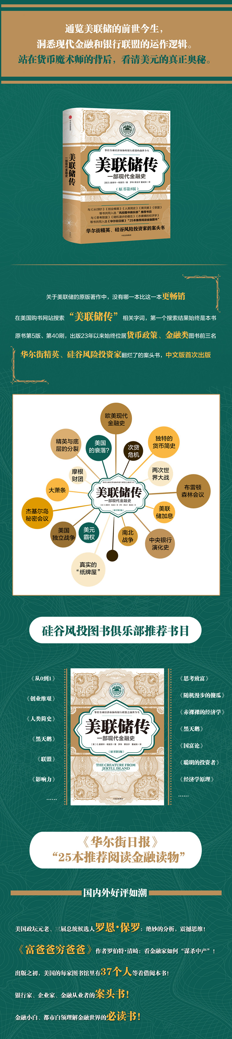美联储之前的欧美银行是如何运作的?美联储参照了哪些银行的“模板”?现代金融是否必然催生出美联储?金融大亨为何会在与世隔绝的杰基尔岛上秘密筹建美联储?美联储为何被设计成一个既非私人也非国有的奇特结构?华尔街与美联储为什么把货币政策包装得如此复杂,让普通人难以理解?为什么美联储可以预测每次经济危机却不能阻止?为什么次贷危机之后美国政府必须救助大而不倒的银行?为什么关于美联储的阴谋论如此盛行?为什么美联储不希望美国削减国债?美联储加息对普通人而言到底意味着什么?……