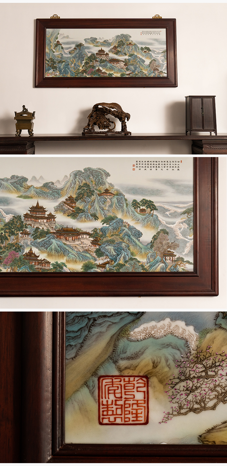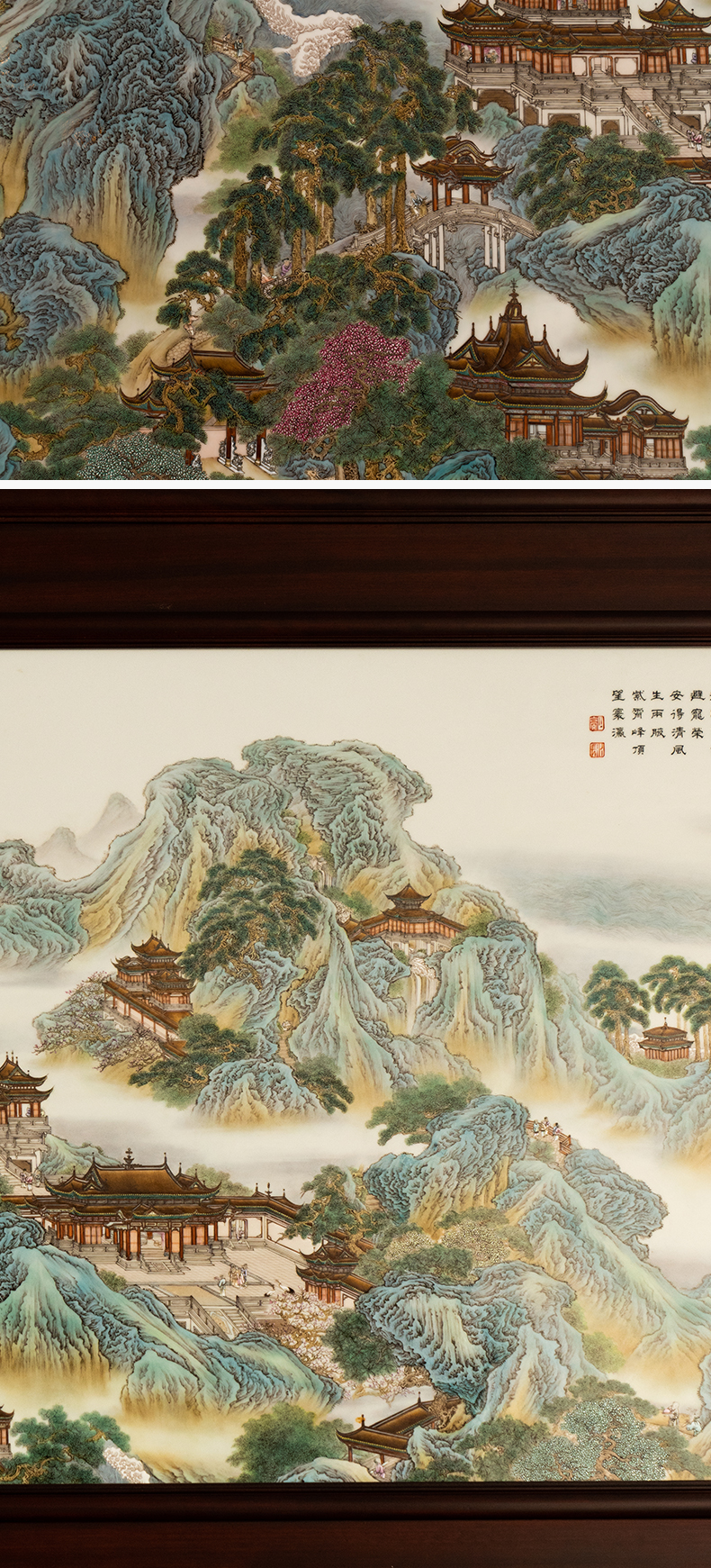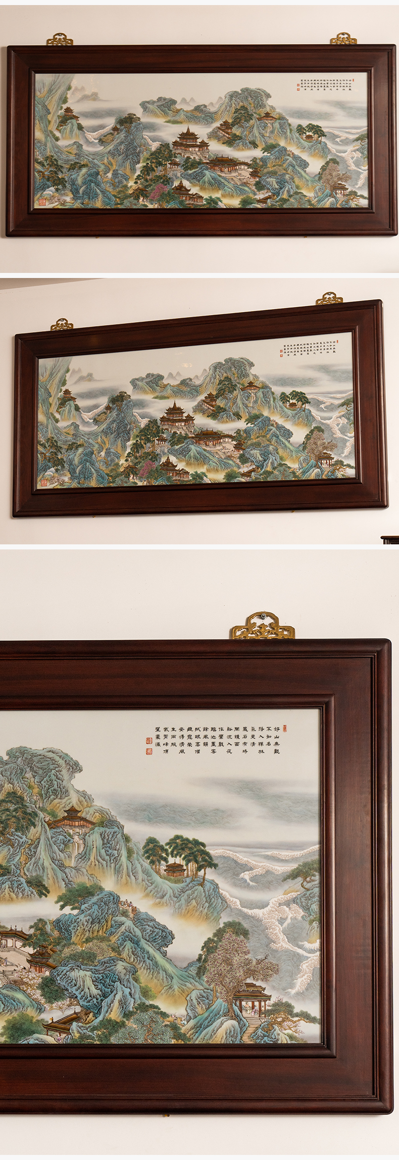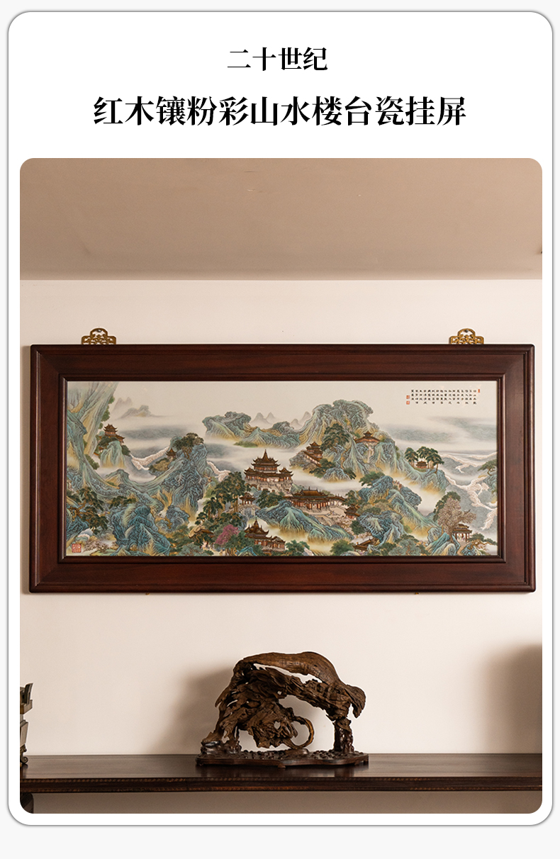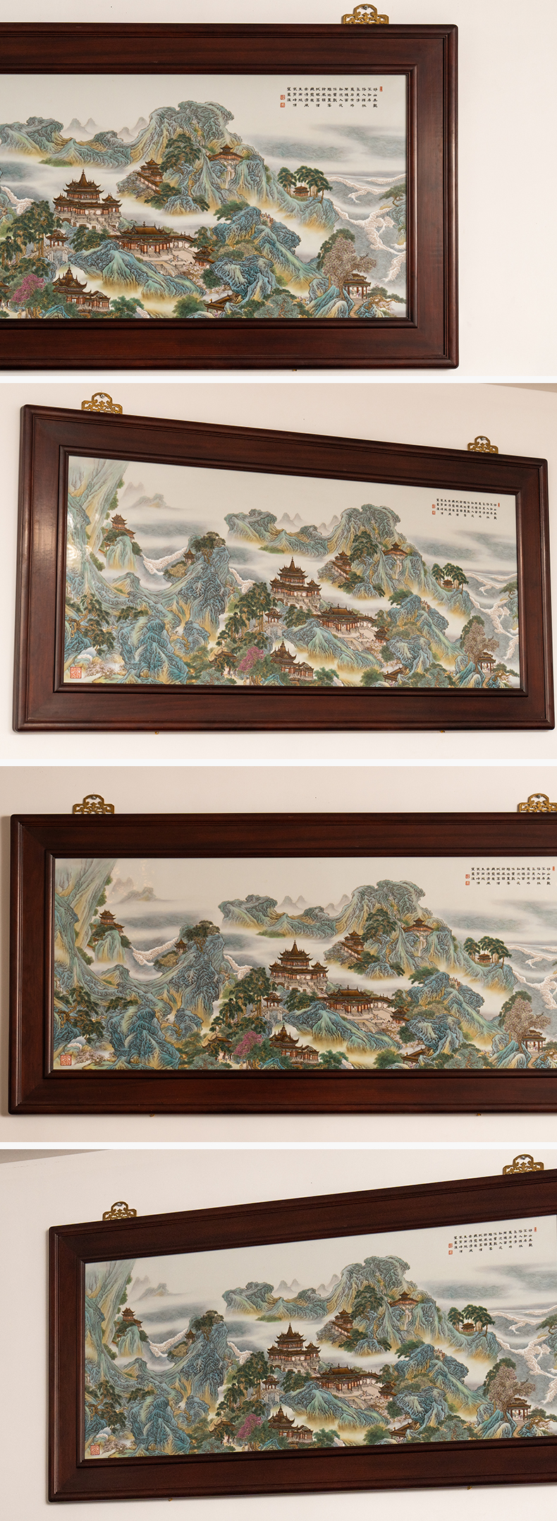 二十世纪 红木镶粉彩山水楼台瓷板画挂屏
