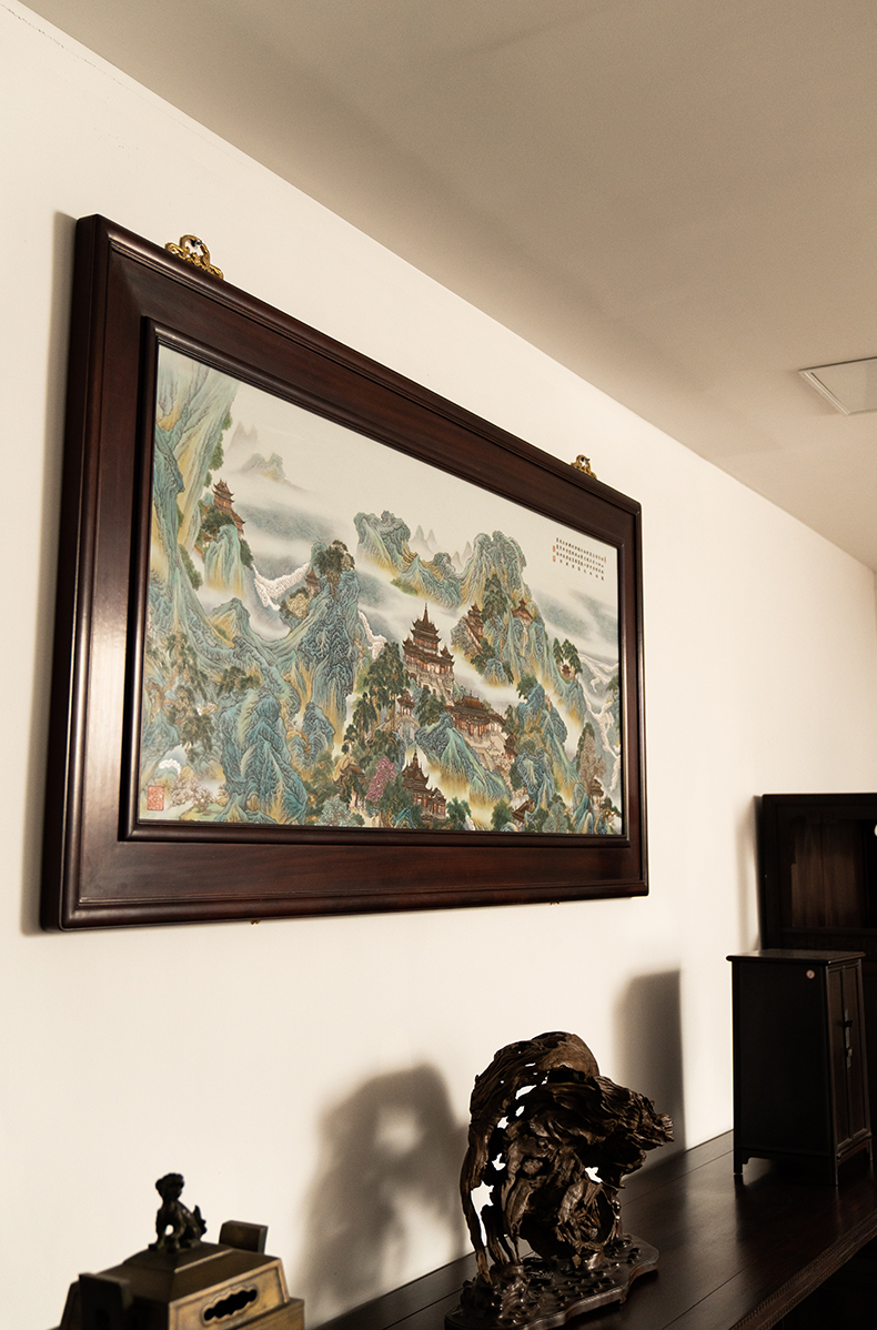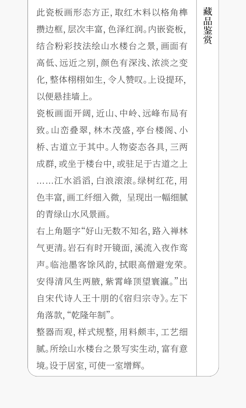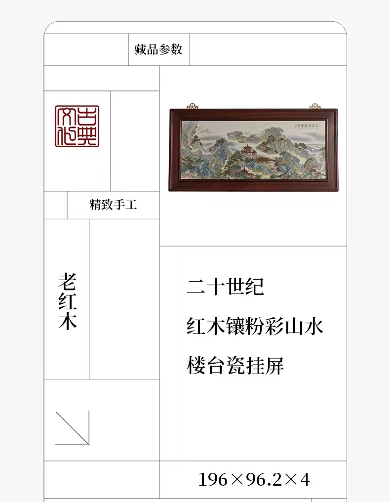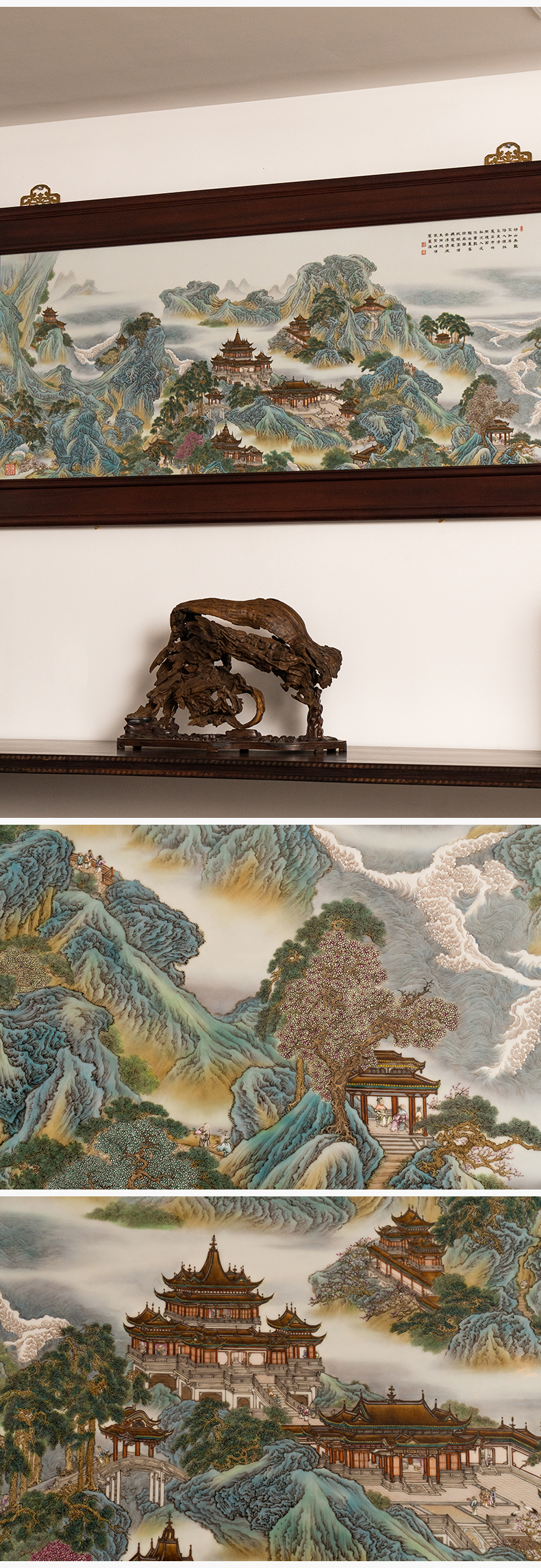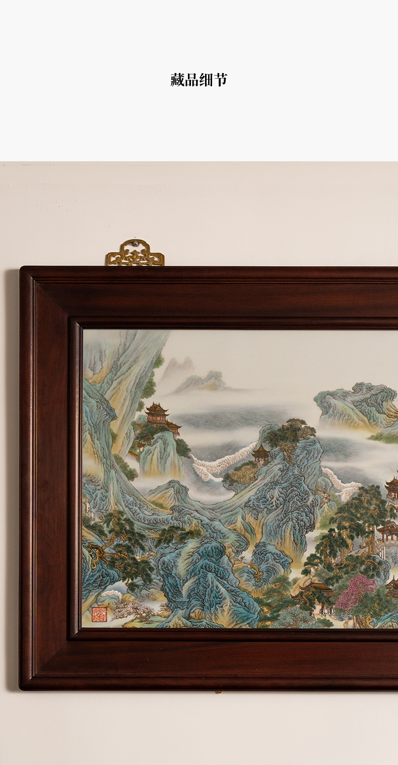 二十世纪 红木镶粉彩山水楼台瓷板画挂屏