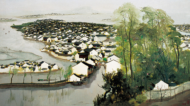这幅表现七十年代绍兴概貌的油彩,自己认为最具代表性,画面通过组合构成,融所见于所思。