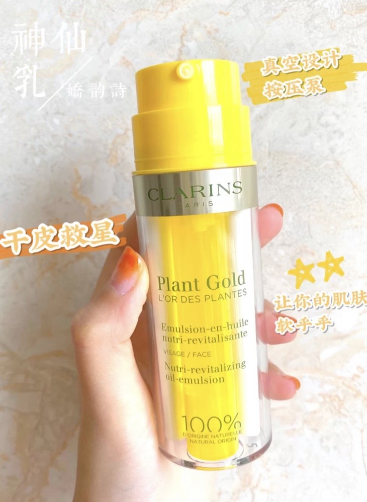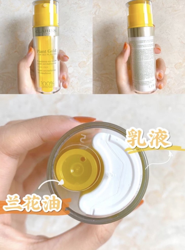 CLARINS娇韵诗双萃精华乳液35ML 👍干皮救星,不可以错过的娇韵诗神仙乳💛!神仙乳的设计和双萃精华一样,油乳分离。关于兰花油的效果,它主打的是保湿修护💦,用起来既可以滋润肌肤,又可以保护肌肤屏障,十分温和,用完皮肤饱满润滑😇,改善干燥细纹,提高肌肤滋润度和柔软度。抗氧化,抗干纹,抗初老👊,提亮肤色,第二天醒来你一定会被惊喜到🌟。质地非常轻薄,吸收速度非常快~孕妇、敏感肌可用