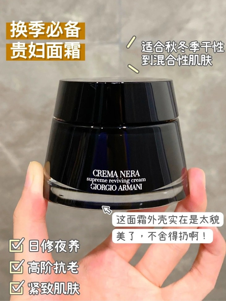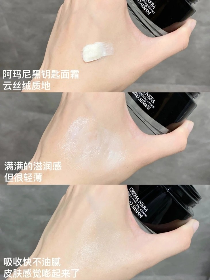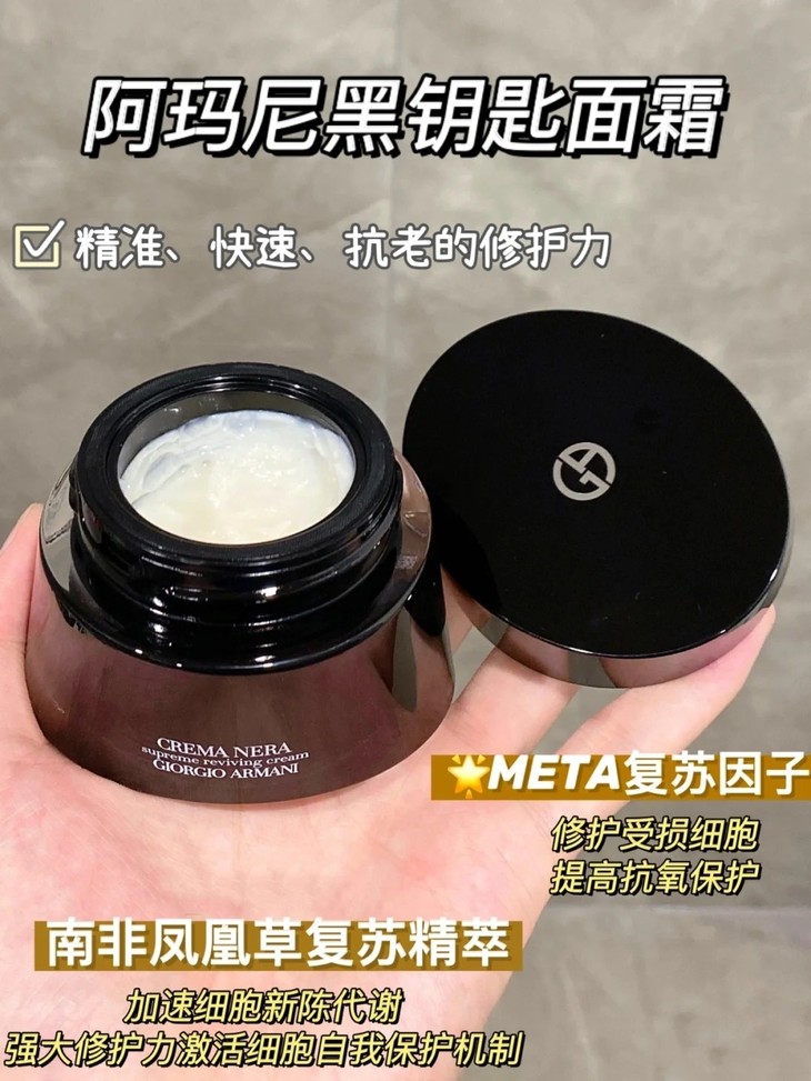 👑阿玛尼黑钥匙面霜30ML/50ML(滋润) 👍作为阿玛尼最高端的护肤系列💥,主打修复、抗老、持久保湿💧, 🌿核心成分有堪称“十年干枯,滴水复活”的复苏之力—“南非凤凰草”精粹, 🌋还添加了火山黑曜岩矿物质的加乘修复, ✅有效快速修复滋养受损肌肤,提升肌肤自愈力。 ❗采用尖端科技最大程度萃取能量,并封层于面霜之中,令面霜发挥最大的作用, ⚡️激活肌肤赋活能量,强化肌肤屏障。 ☁️经典面霜沿袭阿玛尼高定华服质地,如雪融般独特的质地。 😊适合干性和中性肌肤。