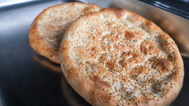 馕的种类有很多,带洋葱的、带肉的,或者是纯面饼不带馅的,这次方野出品的馕是很常见的一种,面饼上洒满芝麻,金黄色的表皮上整齐的排布着花纹, 散落的芝麻让增添了香气,十分诱人。
