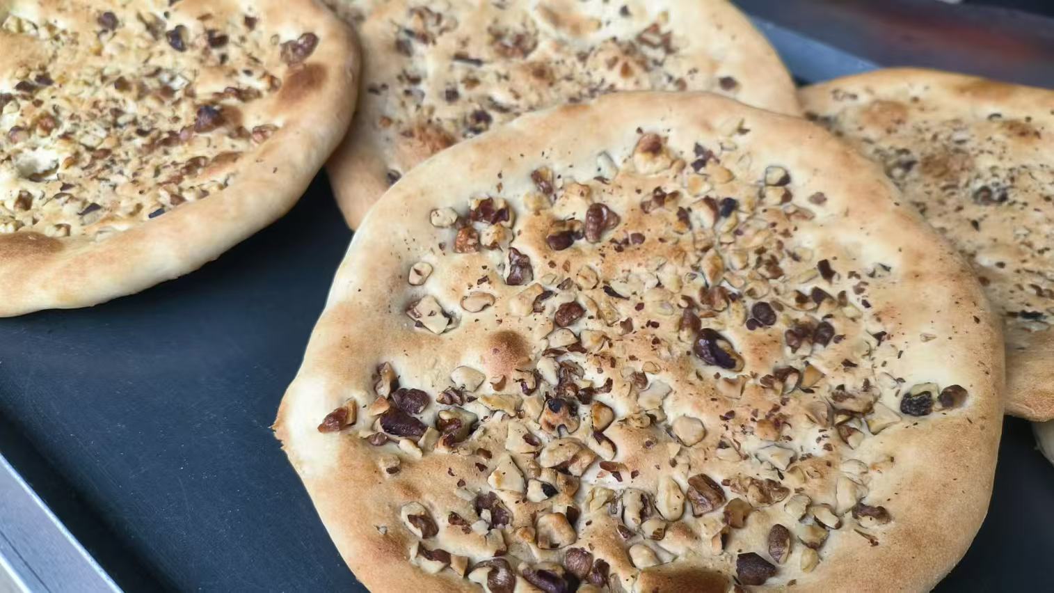 除了芝麻烤馕,还制作了核桃烤馕,核桃仁撒在面饼上,烤得香气四溢,非常美味。