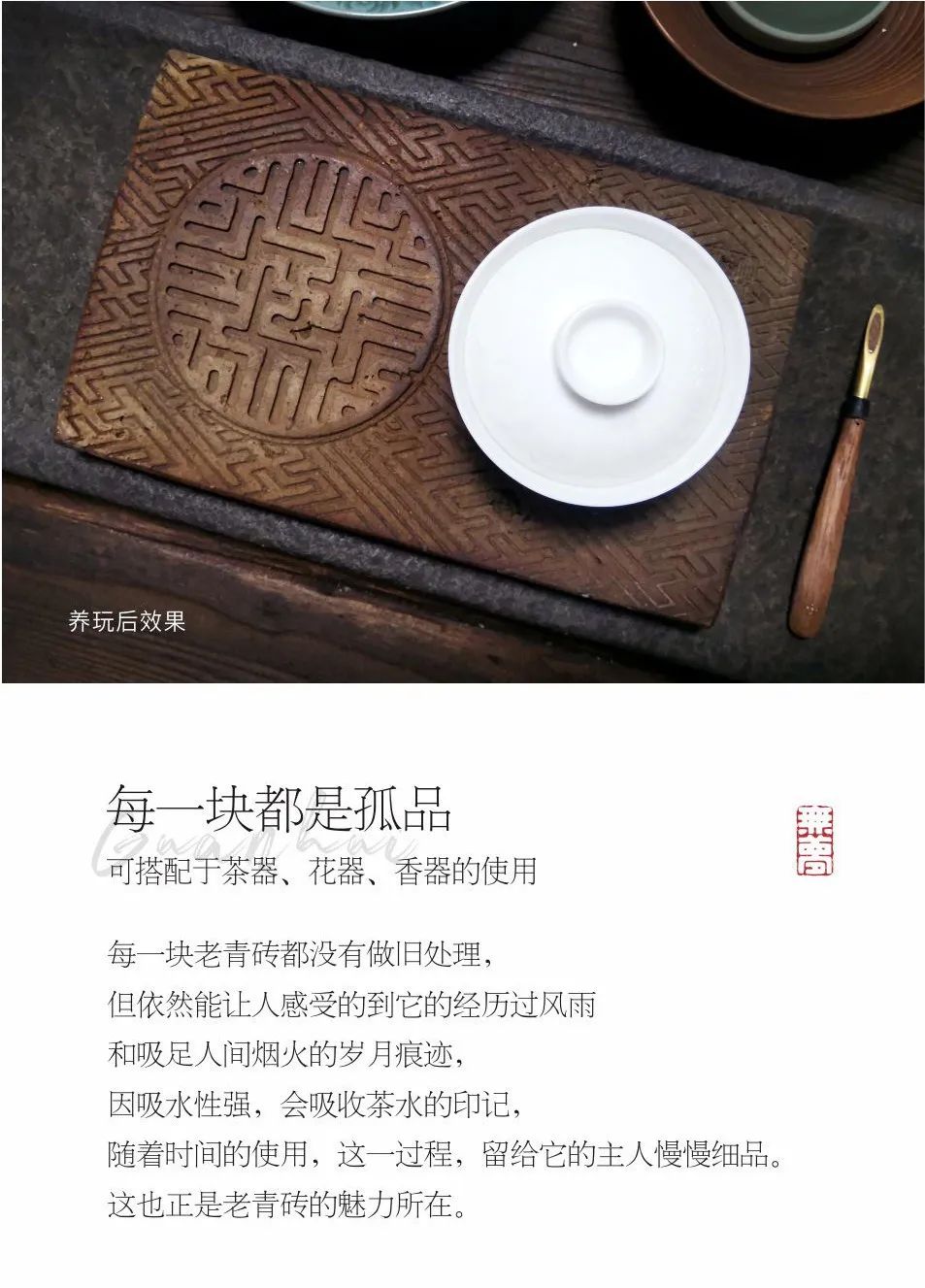 老青砖有很好的透气性,茶倒上去很快就会吸收,长此以往,颜色会变得更深邃,且会留下淡淡茶香。每次用完后,置于通风处晾一晾就行。
