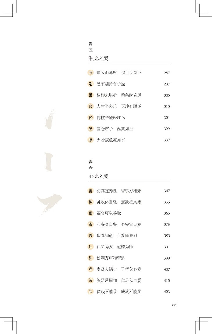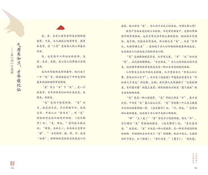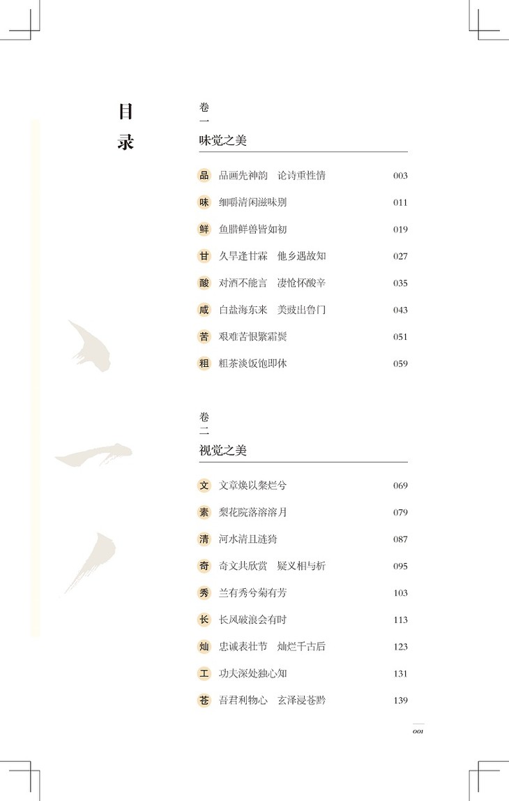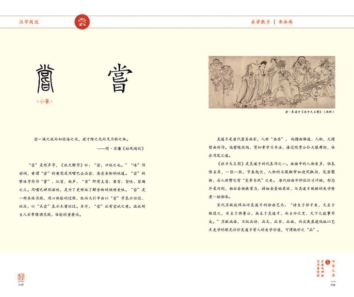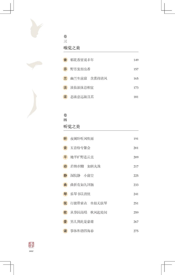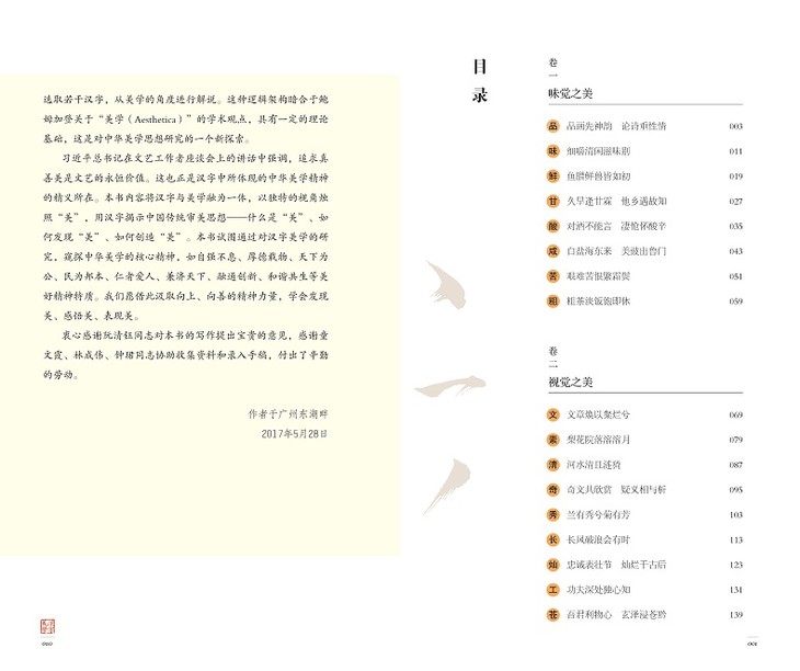 《汉字美学》一书共分六卷,从味觉、视觉、听觉、嗅觉、触觉到心觉去阐述汉字的美学意象。每卷对应不同的感官体验,选取若干汉字,从美学的角度进行解说。这种逻辑架构暗合于鲍姆加登关于“美学(Aesthetica)”的学术观点,具有一定的理论基础,这是对中华美学思想研究的一个新探索。本书内容将汉字与美学融为一体,以独特的视角烛照“美”,用汉字揭示中国传统审美思想——什么是“美”、如何发现“美”、如何创造“美”。本书试图通过对汉字美学的研究,窥探中华美学的核心精神,如自强不息、厚德载物、天下为公、民为邦本、仁者爱人、兼济天下、融通创新、和谐共生等美好精神特质。以籍此汲取向上、向善的精神力量,以期引导读者学会发现美、感悟美、表现美。