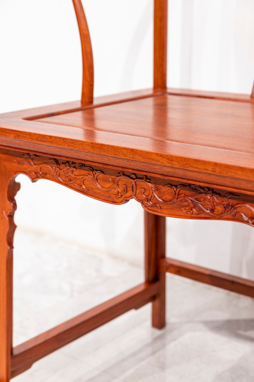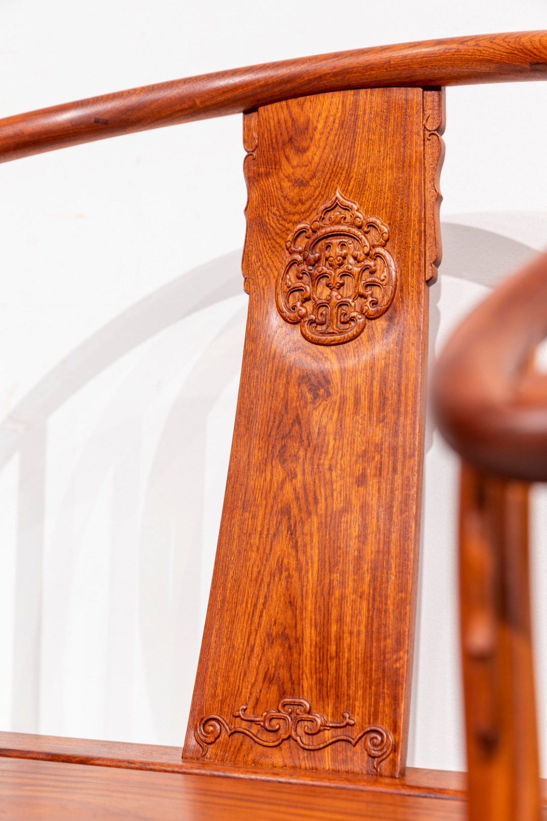 此款圈椅扶手收尾弯头见方,成圆钮形,靠背独板,上部减地刻团花卷叶塔刹纹,下部起阳线刻卷草纹亮脚,前后腿一木连做,鹅脖三弯,与扶手间嵌入小角牙,联帮棍上细下粗,柔美考究。座面攒边打槽装独板面芯,边抹冰盘沿,座面下正面及两侧为壸门券口牙子,沿边起饱满阳线,正面牙板上浮雕缠枝莲纹,四足间装步步高赶枨,整体风格威严不凡,又舒展圆融。