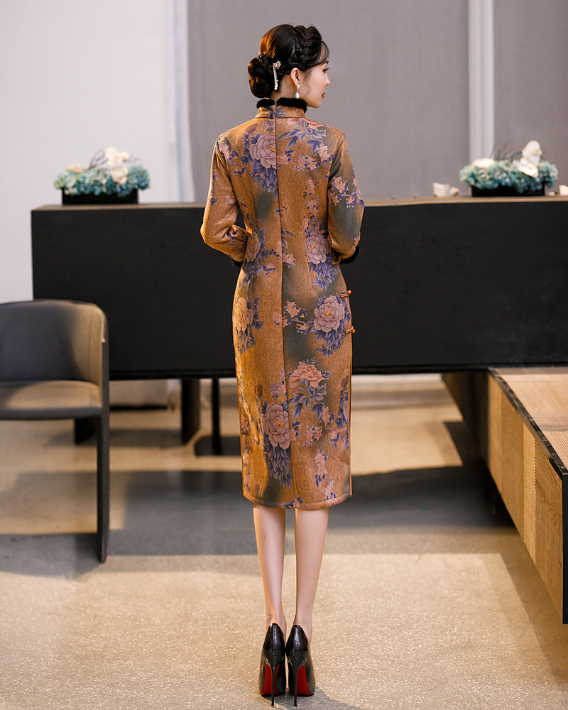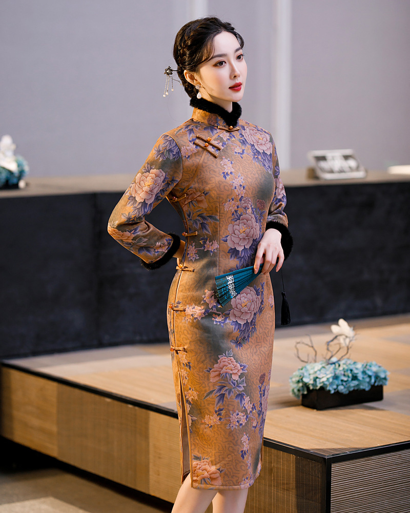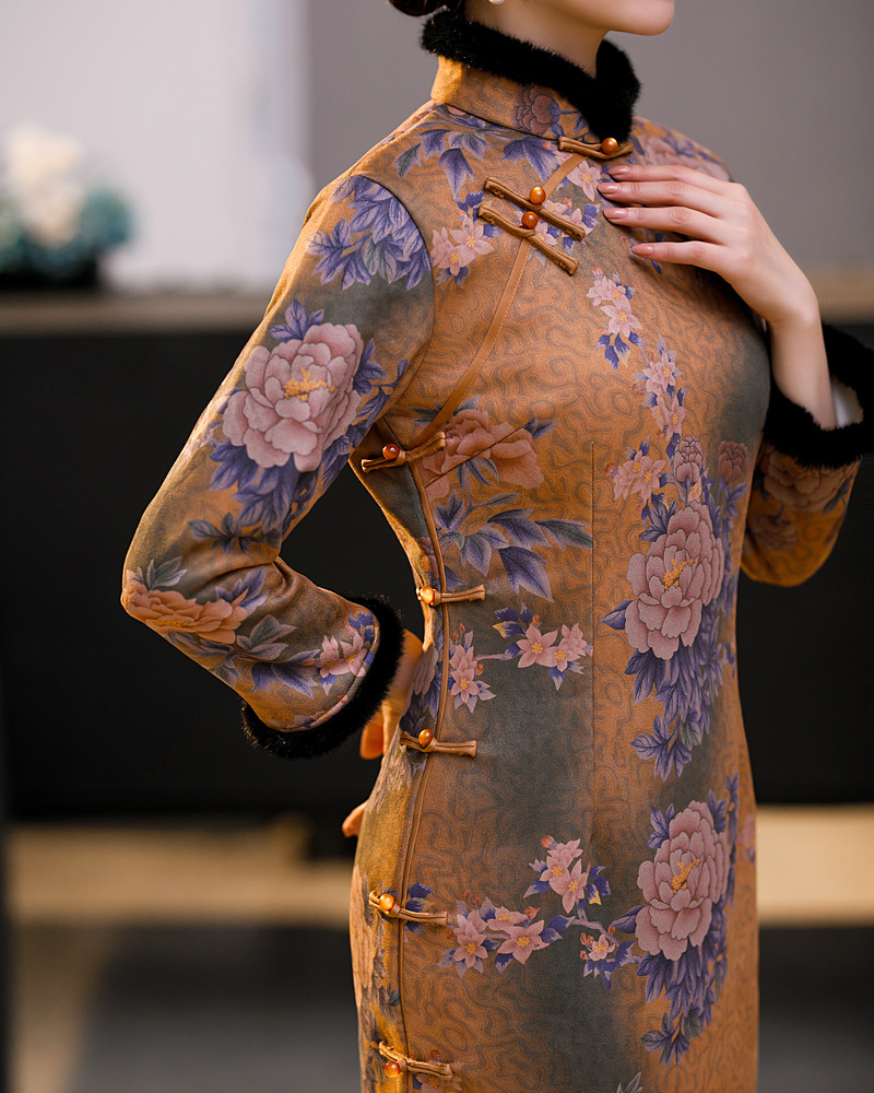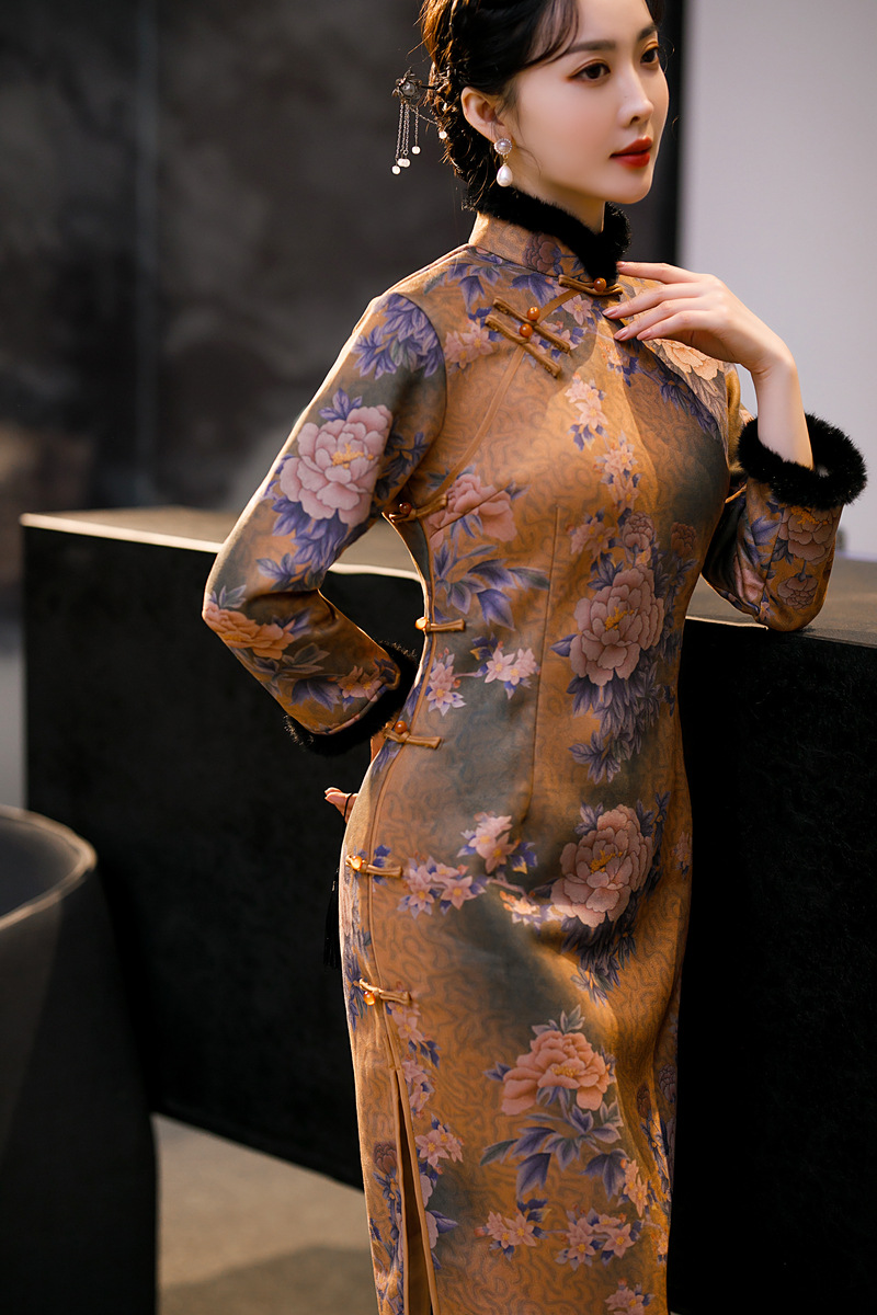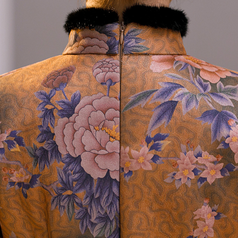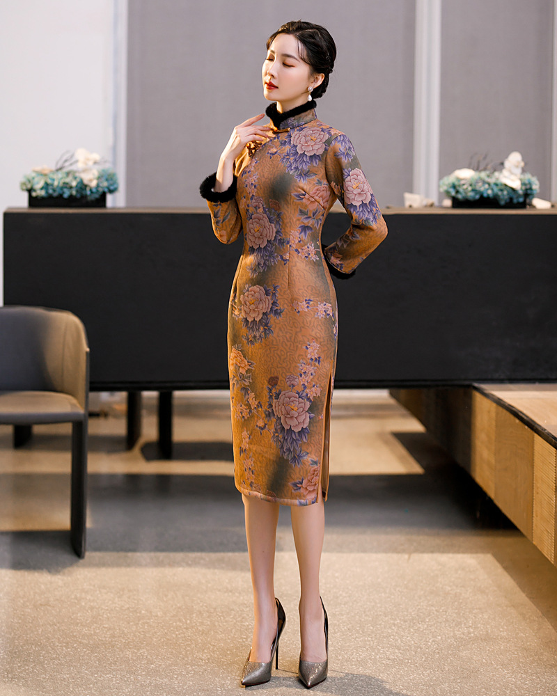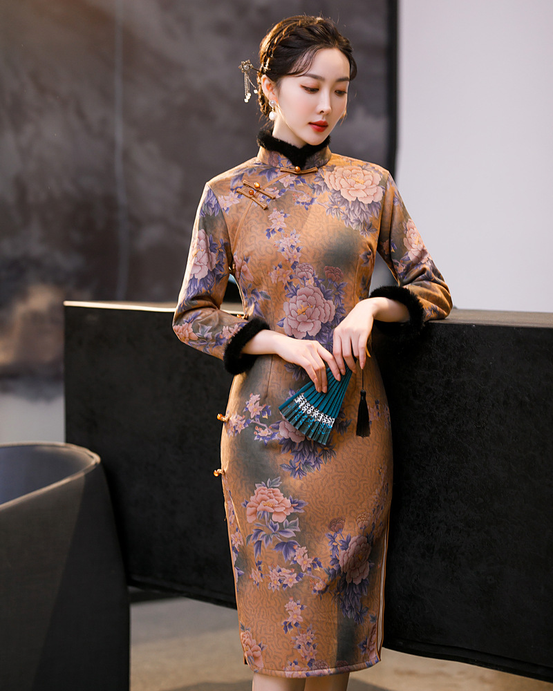 上海旗袍厂ZAYS-82228秋冬毛领旗袍2021年新款改良复古加厚加绒改良气质修身旗袍裙