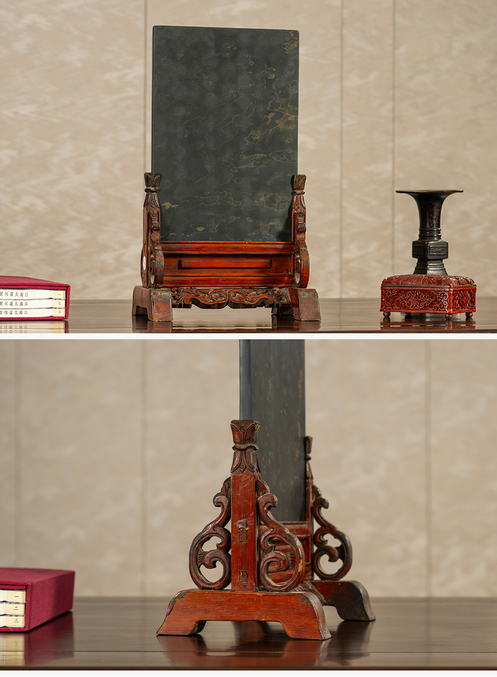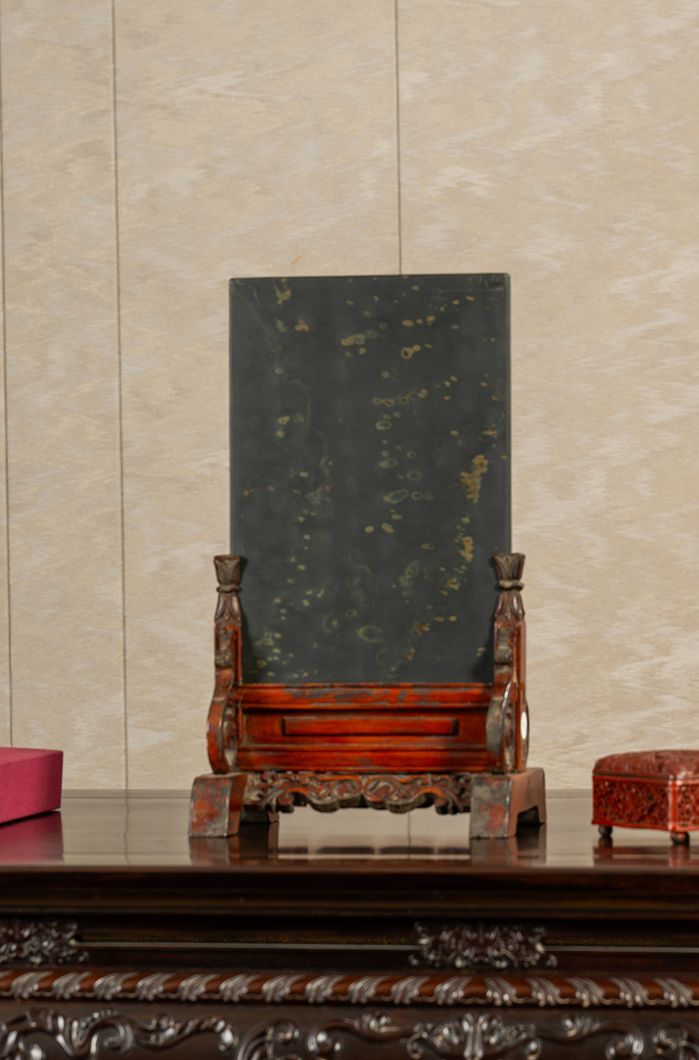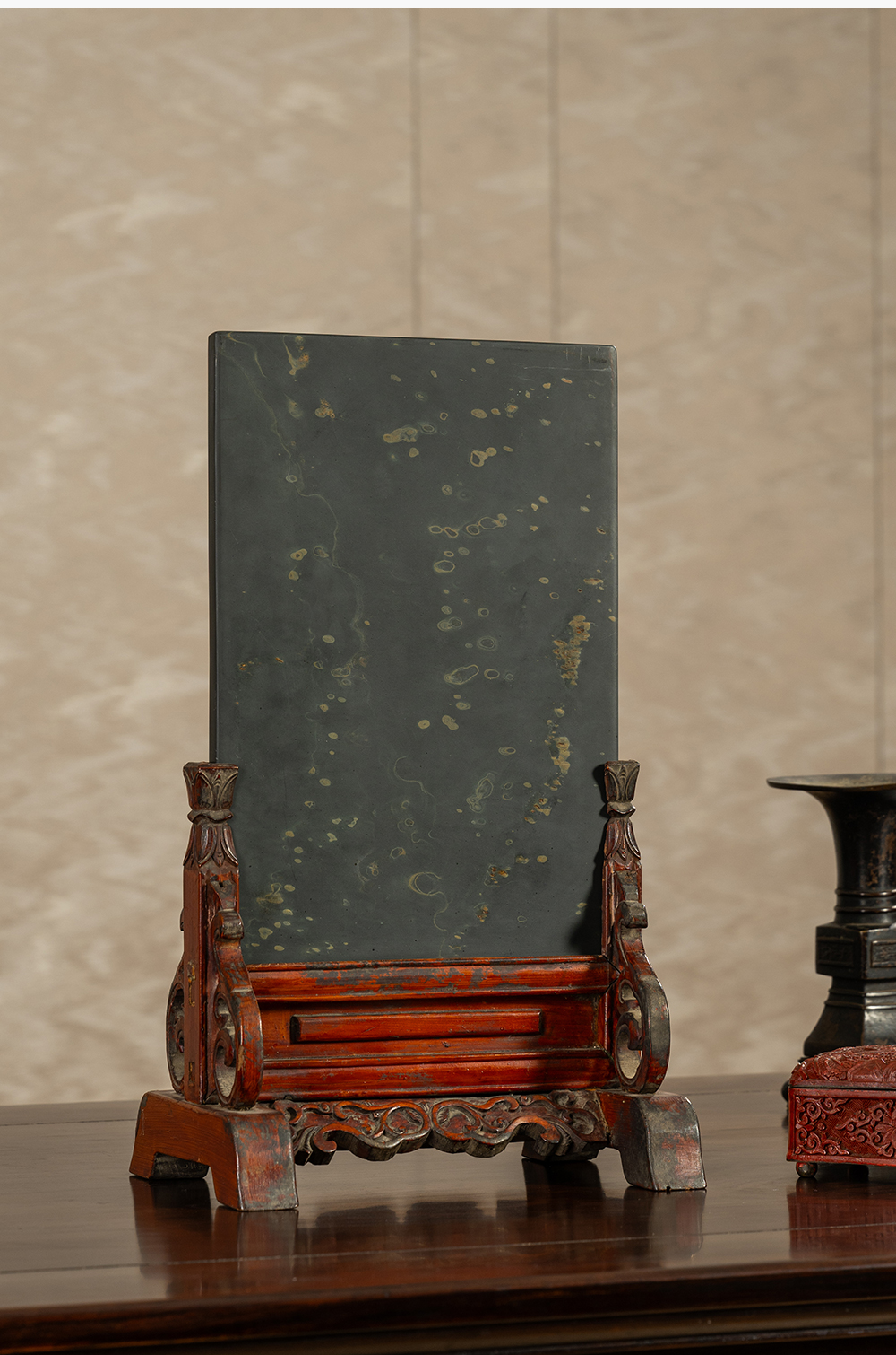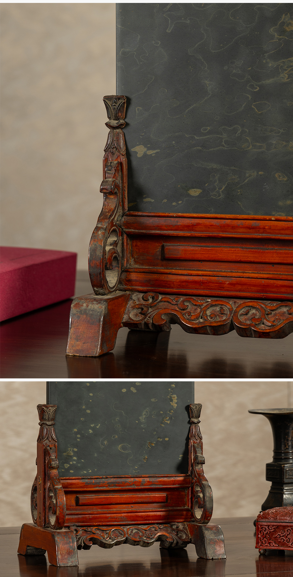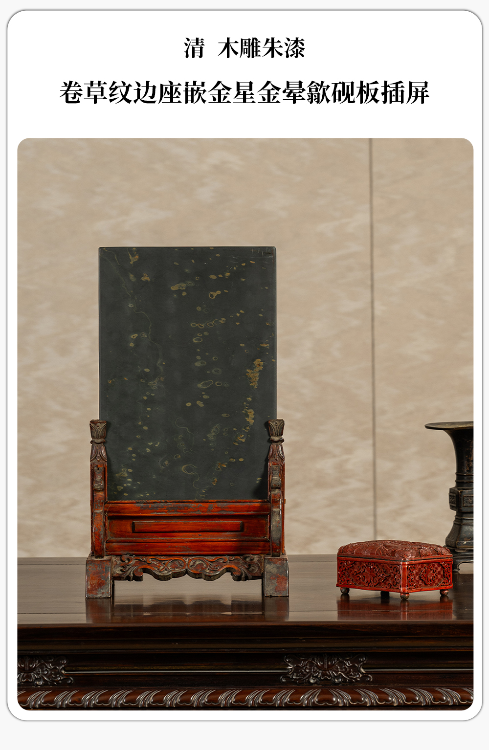 清 木雕朱漆卷草纹边座嵌金星金晕歙砚板插屏