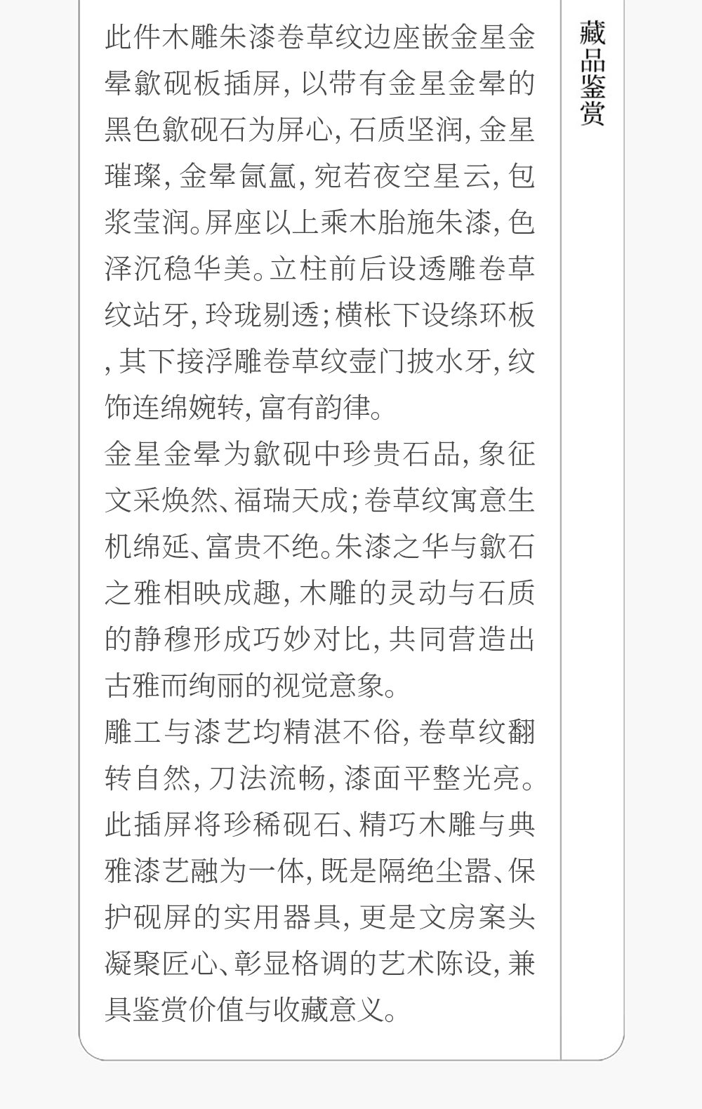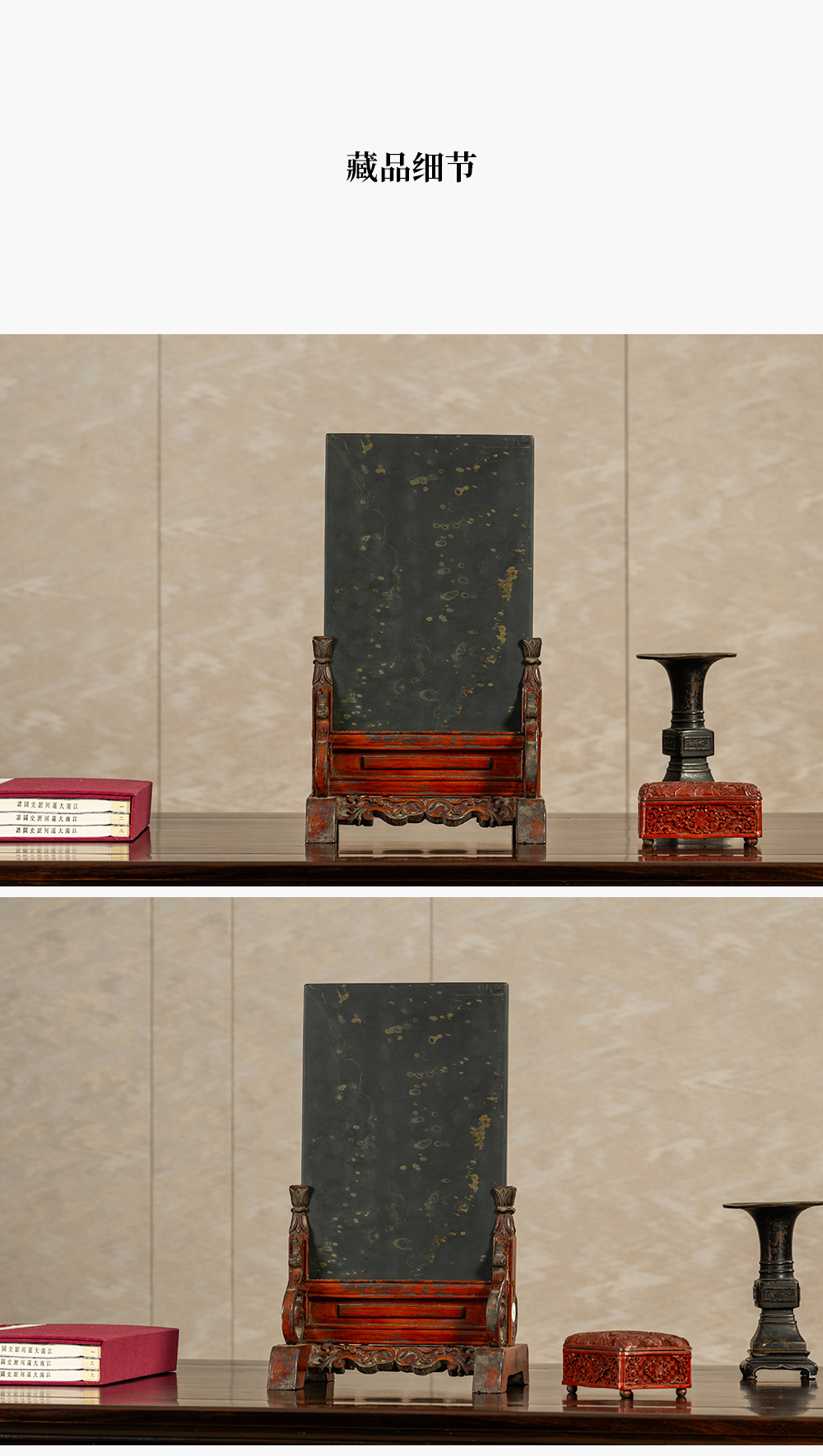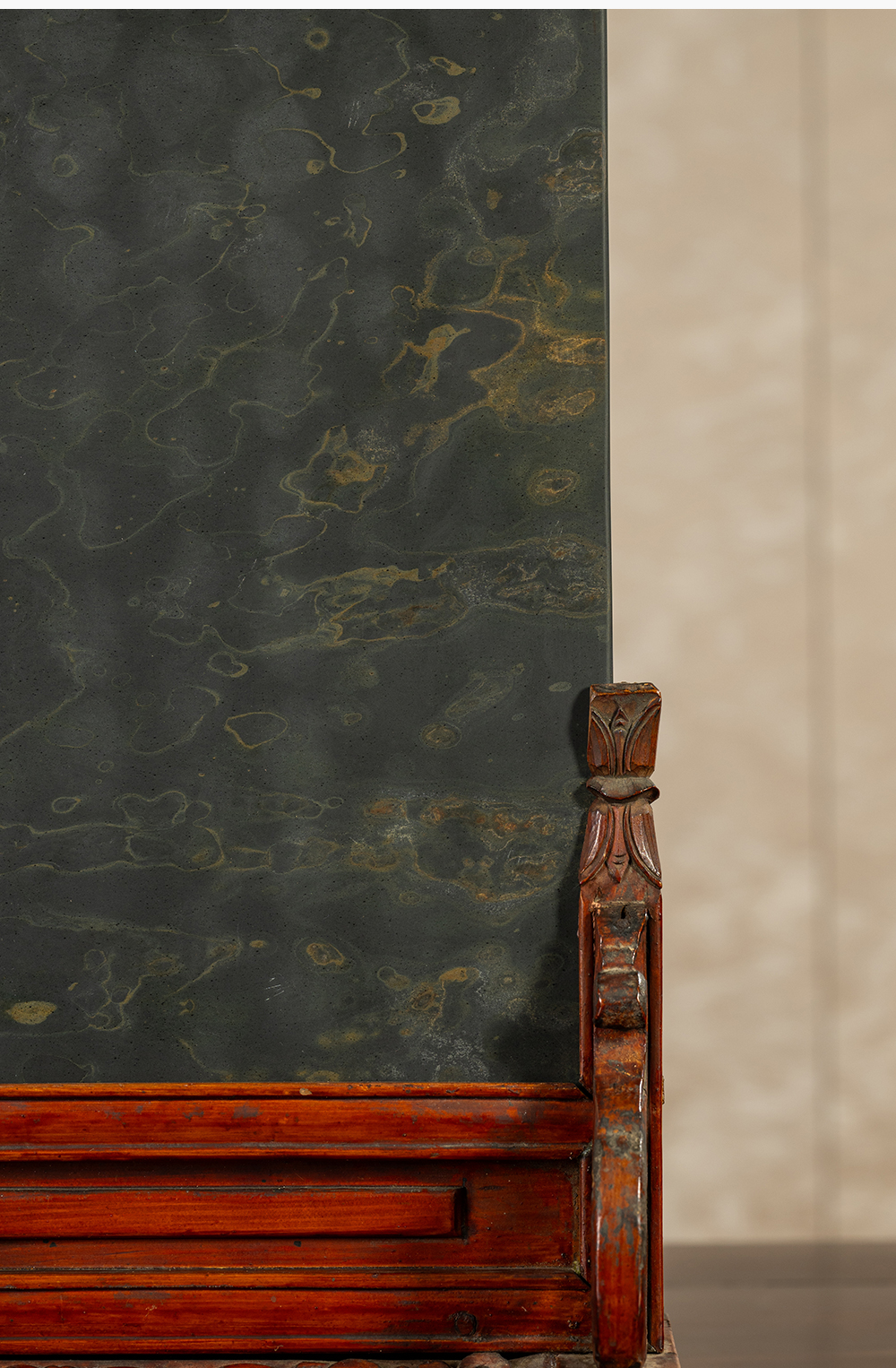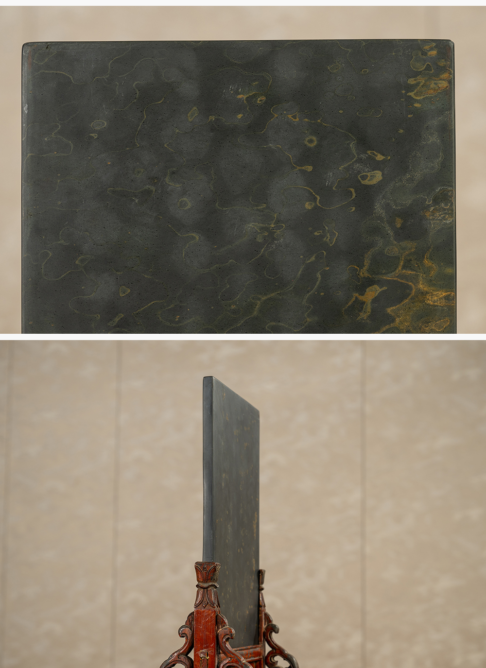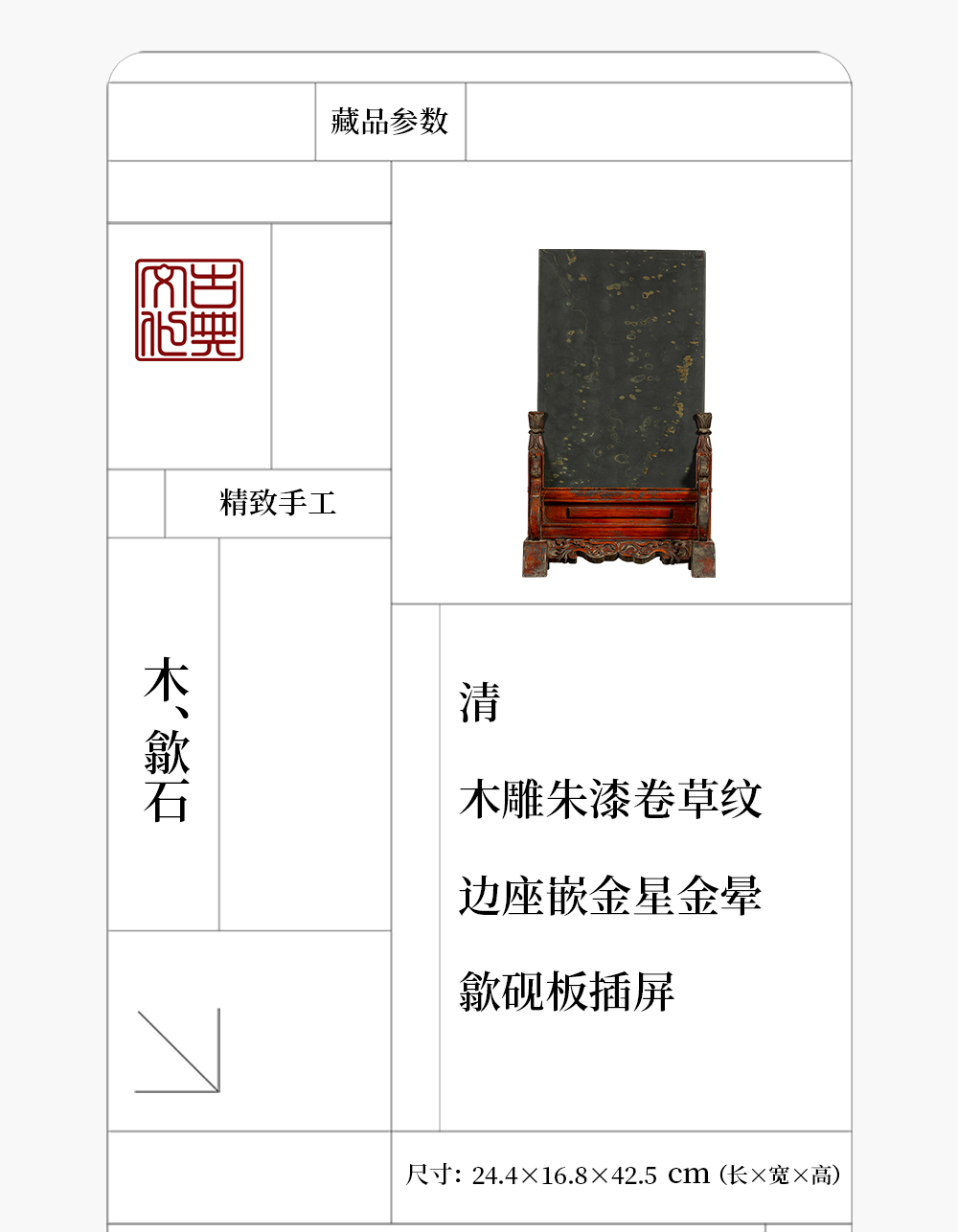 清 木雕朱漆卷草纹边座嵌金星金晕歙砚板插屏