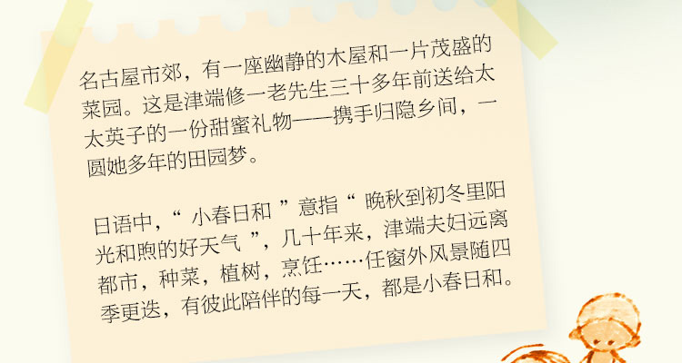 《明天也是小春日和》是一本记述津端夫妇田园生活的随笔。为了一圆妻子英子多年的田园梦,津端修一老先生在退休后带着英子远离都市的喧嚣,归隐乡间,用几十年时间悉心打理着自家的木屋和菜园,调配泥土,种植蔬菜,研究食谱,腌制食物……任窗外风景随四季更迭,有彼此陪伴的每都是好天气。他们在身体力行中向人们展示了一种优雅的生活方式,道出了几十年幸福婚姻的秘诀。