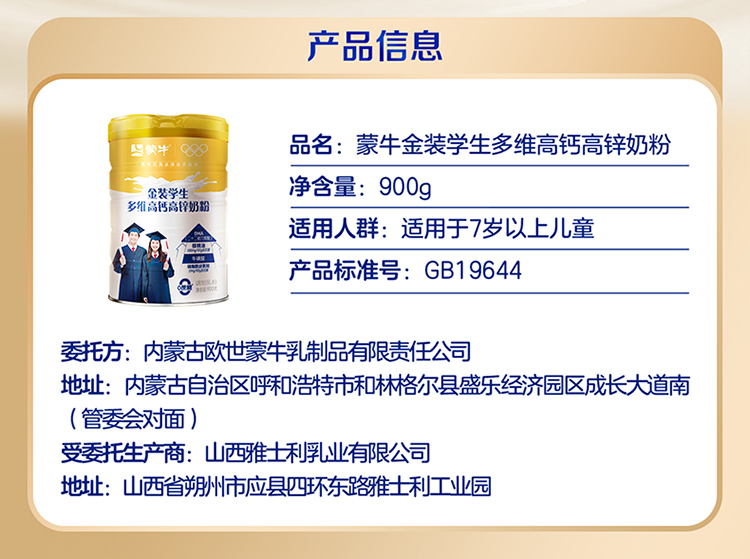 蒙牛金装学生多维高钙高锌奶粉900g(升级版)