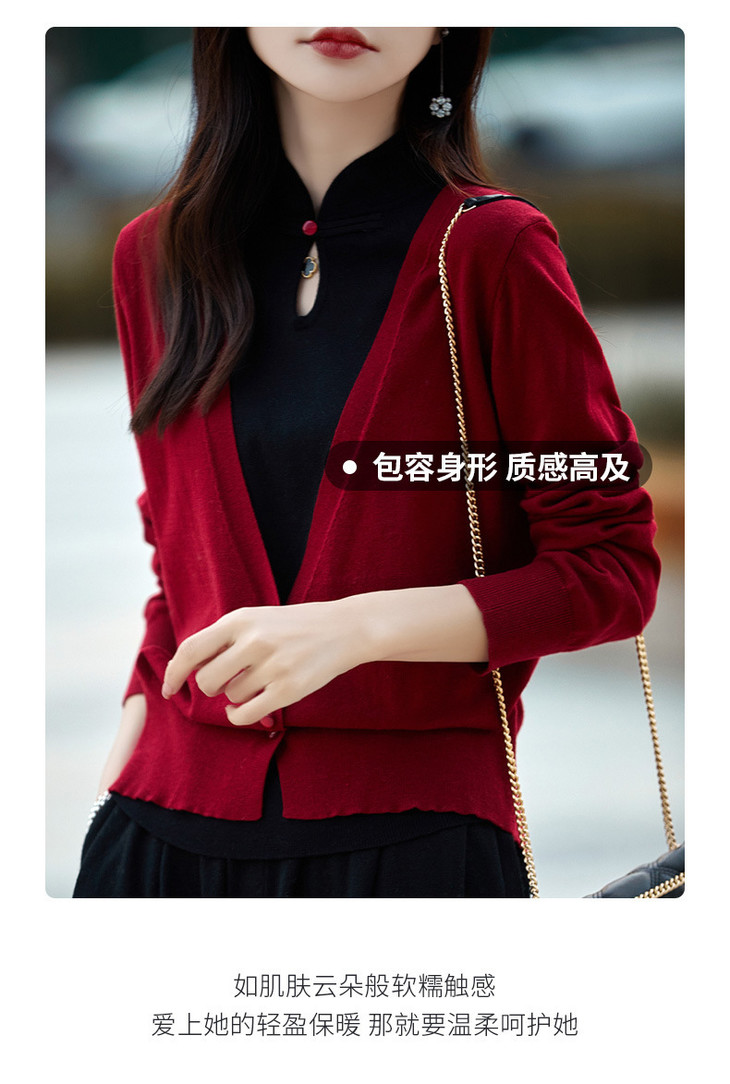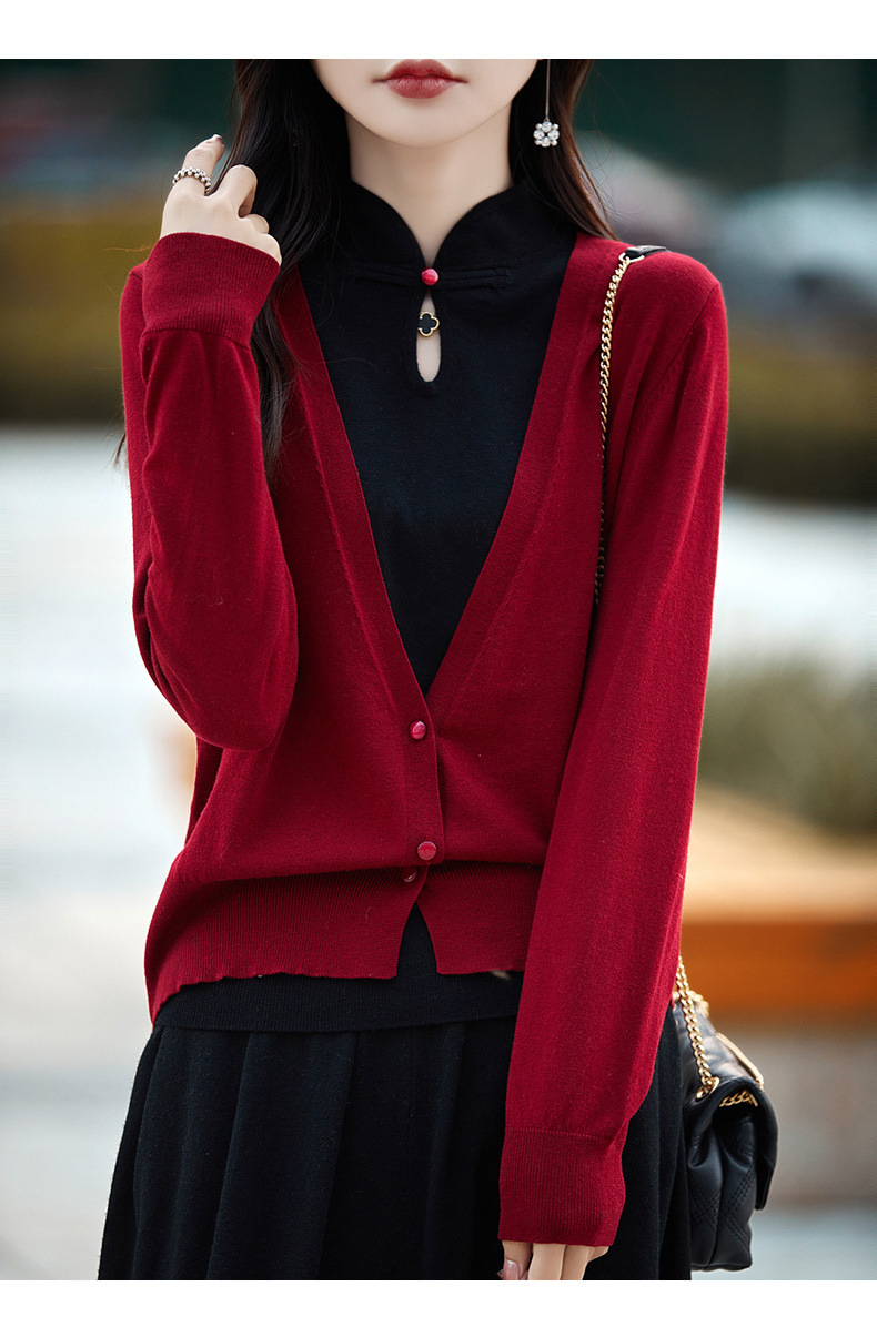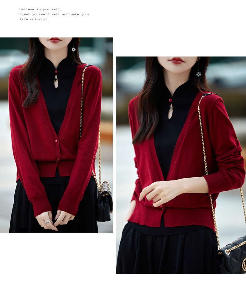 中国风假两件羊毛开衫,旗袍领针织套头毛衣中式盘扣羊绒打底外套NS3170
