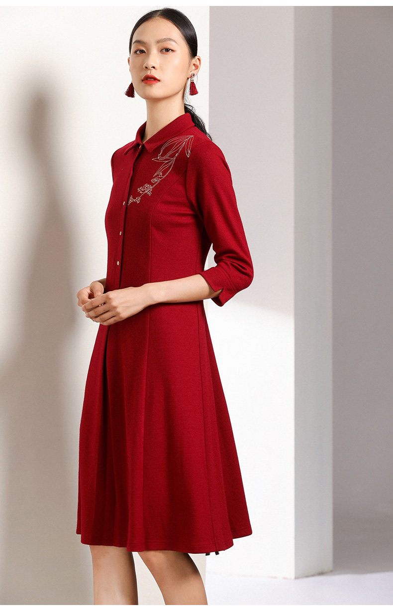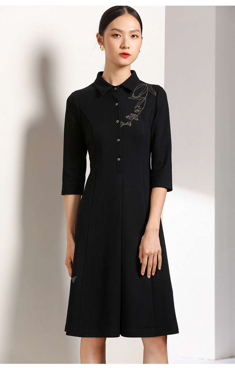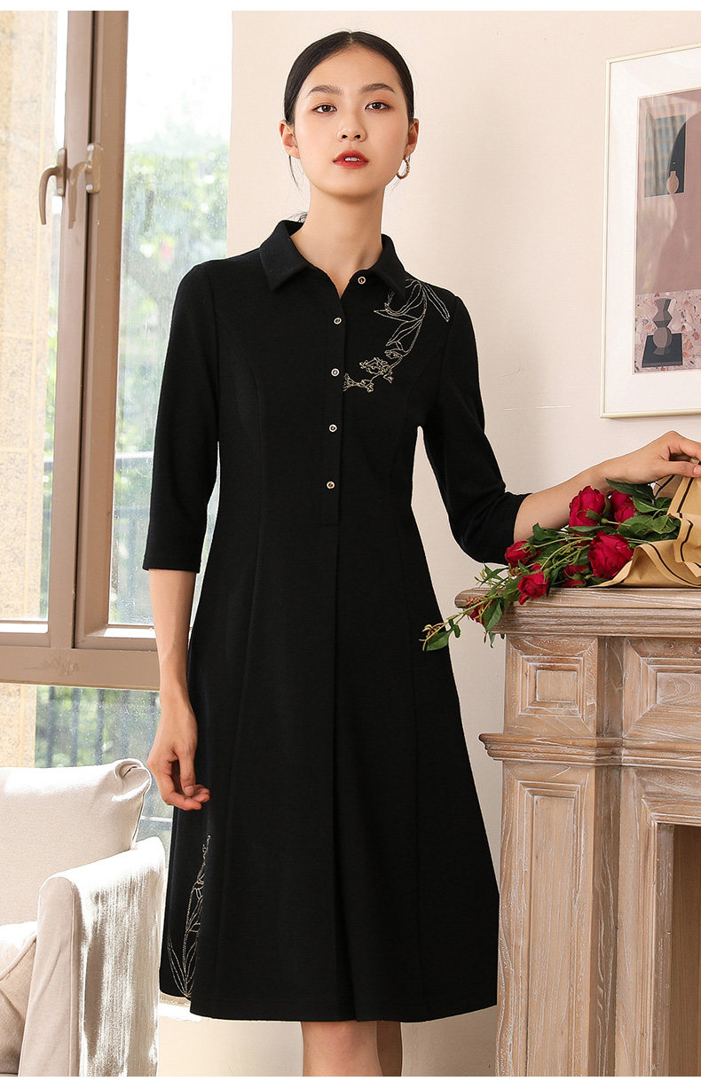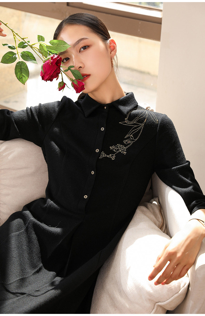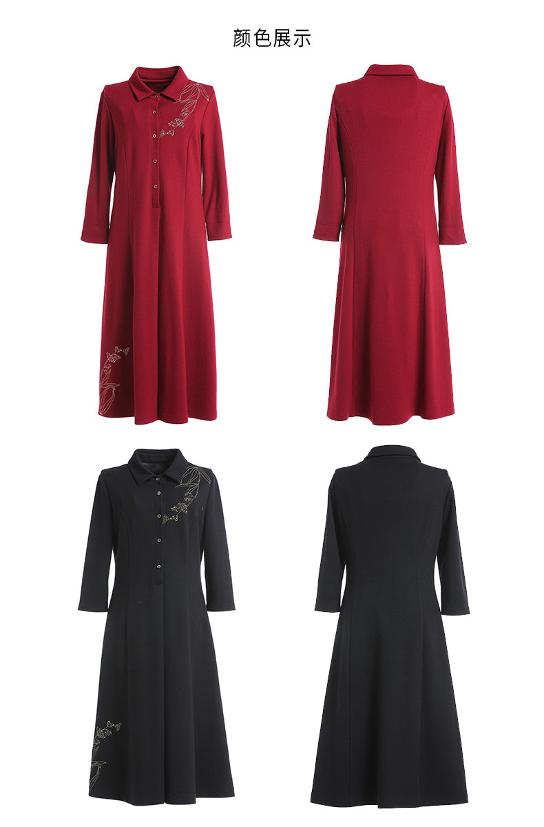 【两色可选】乔万尼秋装高腰修身显瘦气质刺绣长袖连衣裙中长款EN3E378