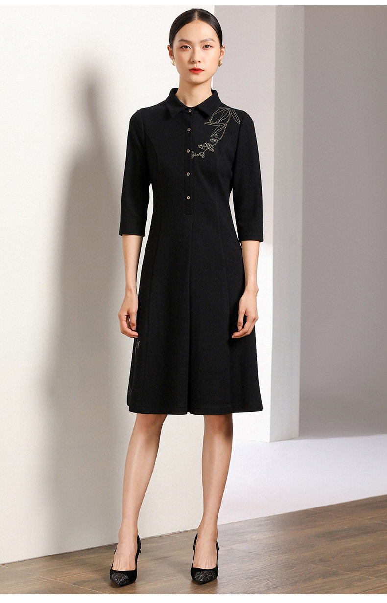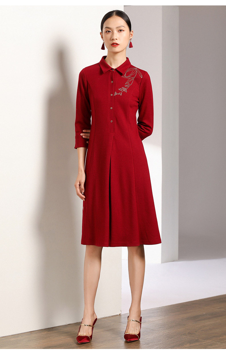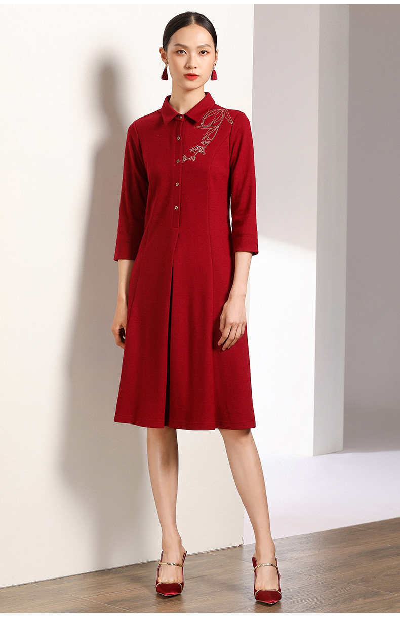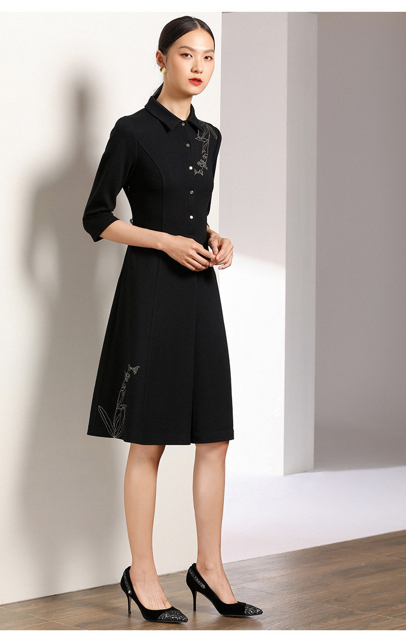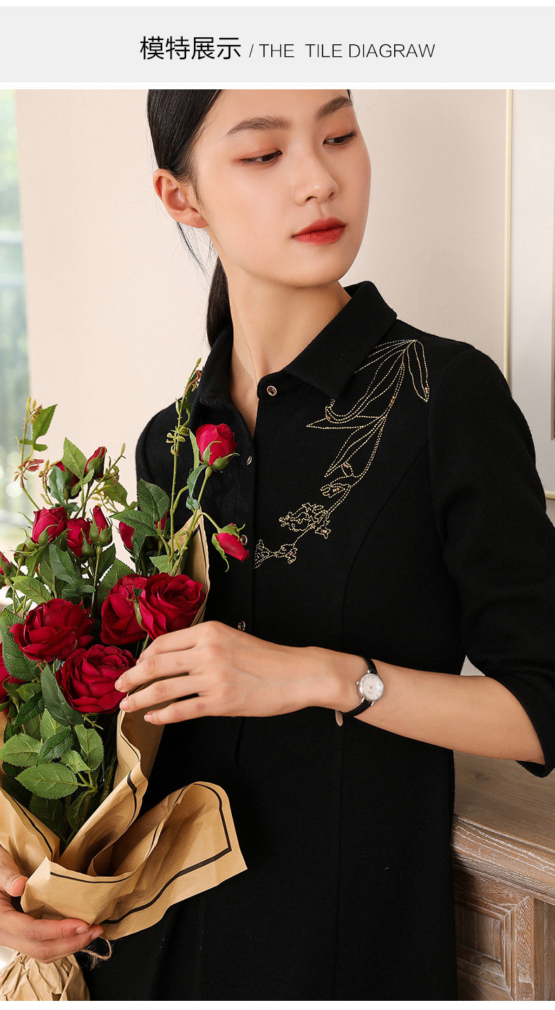 【两色可选】乔万尼秋装高腰修身显瘦气质刺绣长袖连衣裙中长款EN3E378