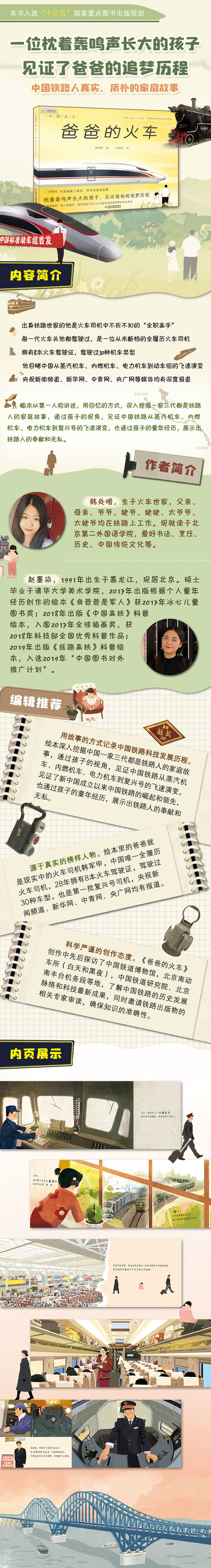 3、科学严谨的创作态度。《爸爸的火车》创作中先后探访了中国铁道博物馆,北京南动车所(白天和黑夜),中国铁道研究院、北京南丰台机务段等地,了解中国铁路的历史发展脉络和科技最z x新成果,确保知识的准确性。
