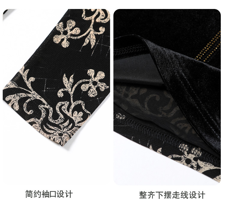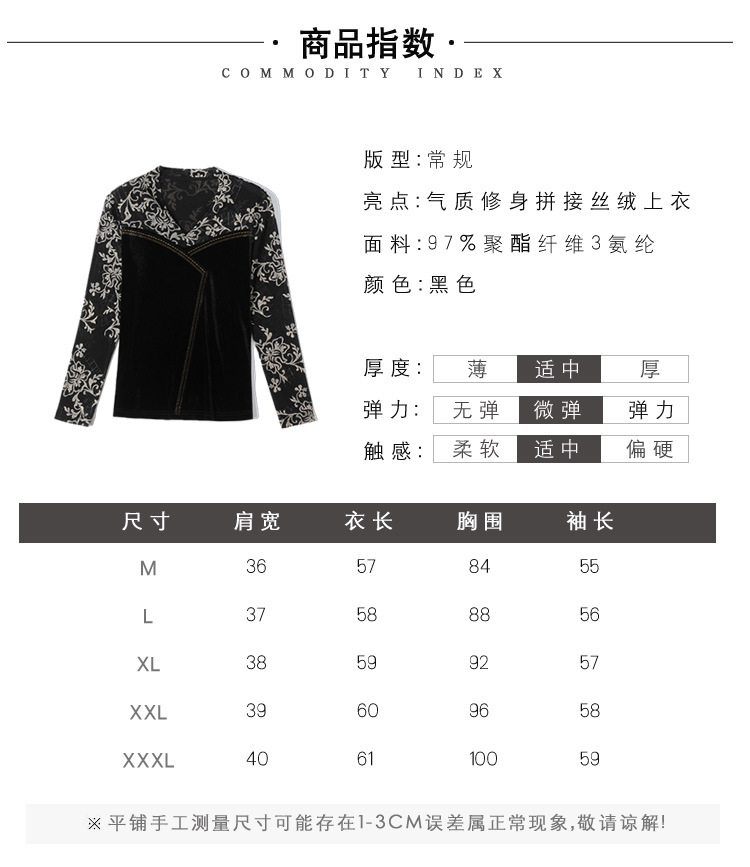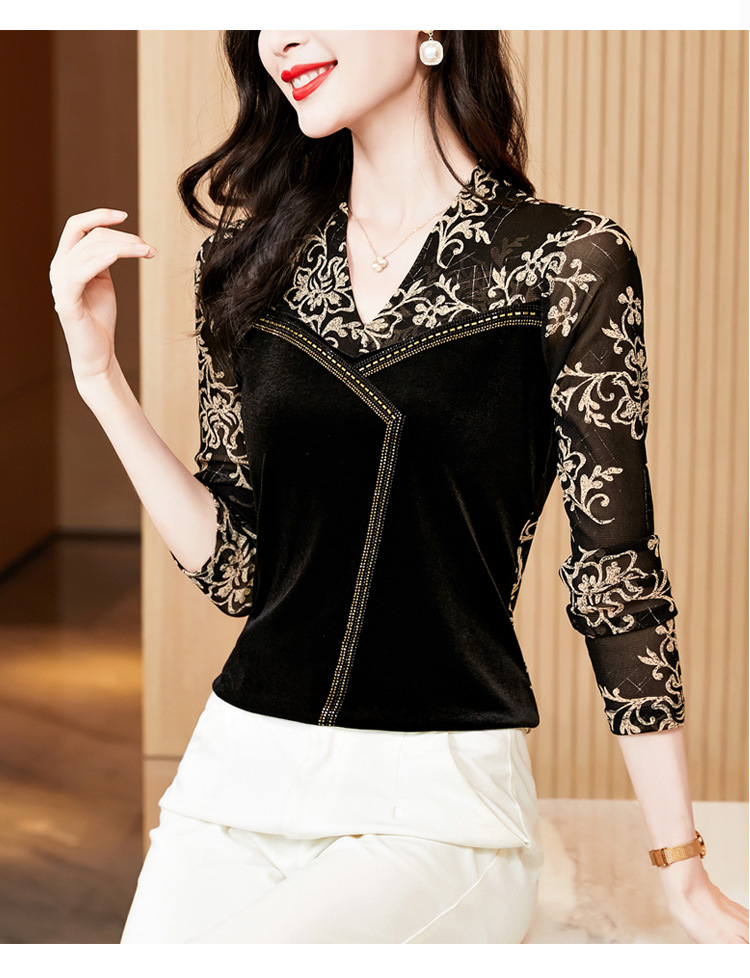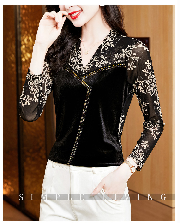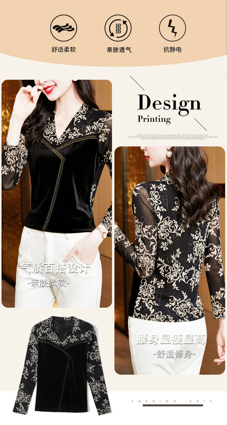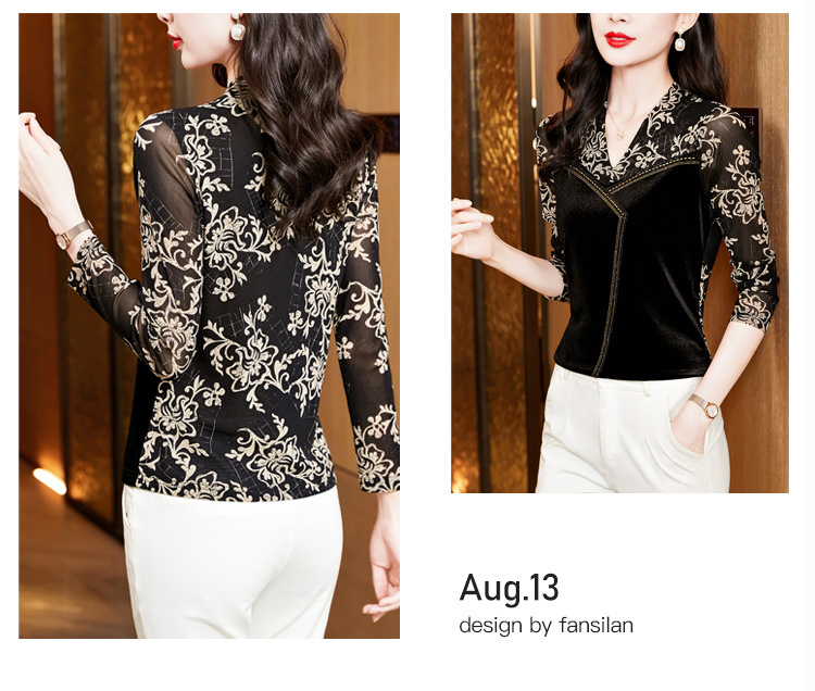 修身显瘦,新款气质V领印花网纱拼接丝绒烫钻打底衫KQL-E37M2708