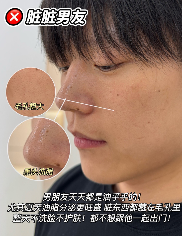 ⚠️男性的肤质和女性有很大的区别 角质层较厚又容易出油 女性护肤品根本不能够通用 有时甚至起到反作用💢 而不注意护肤的男生 脸上很容易泛油光、闷痘痘❓