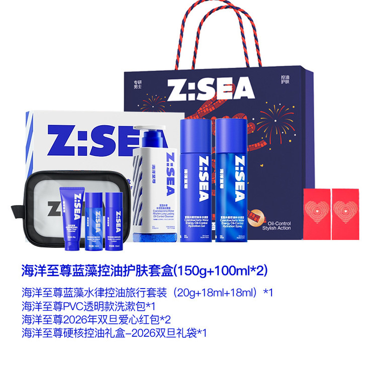 新年特惠开团价💰:149.9到手满满一大堆🥳 海洋至尊蓝藻控油护肤套盒(150g+100mI*2)*1 送:海洋至尊蓝藻水律控油旅行套装(20g+18ml+18ml)*1 送:海洋至尊PVC透明款洗漱包*1 送:海洋至尊2026年双旦爱心红包*2 送:海洋至尊硬核控油礼盒-2026双旦礼袋*1