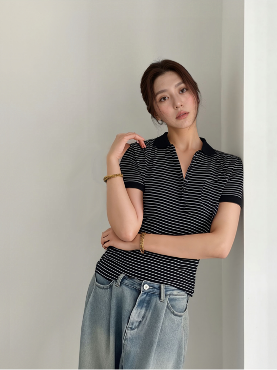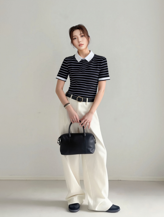 翻领条纹 POLO(100% 棉) ✅吸湿透气性极佳 ✅夏季穿着不易闷热 ✅贴合肌肤时触感柔软无负担 经典蓝白、黑白细条纹 保留商务场合的严谨性 又通过棉质的柔软调性弱化正式感 适合商务通勤、客户拜访等半正式场景