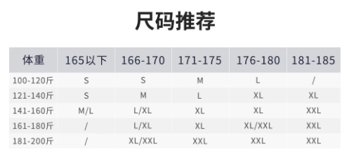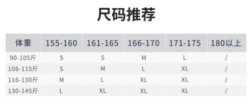 男款尺码表(上衣+裤子)