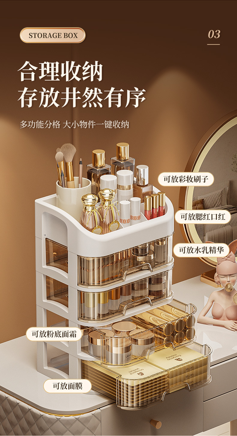 「ins级优雅!梳妆仪式感」化妆品收纳盒 桌面梳妆台化妆镜护肤品置物架口红整理箱桌上抽屉式 商品图3