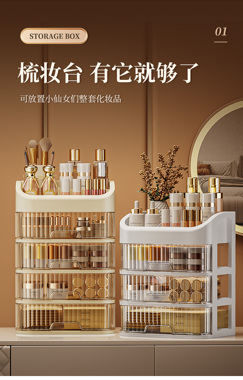 「ins级优雅!梳妆仪式感」化妆品收纳盒 桌面梳妆台化妆镜护肤品置物架口红整理箱桌上抽屉式 商品图2