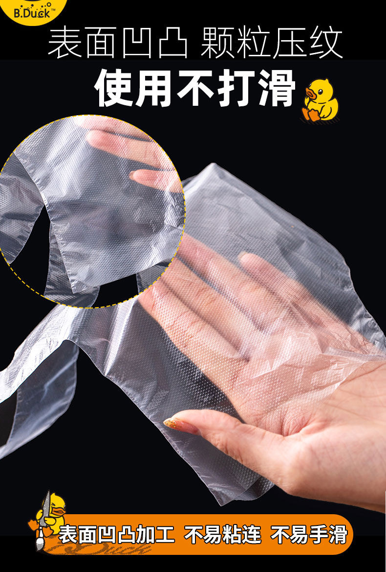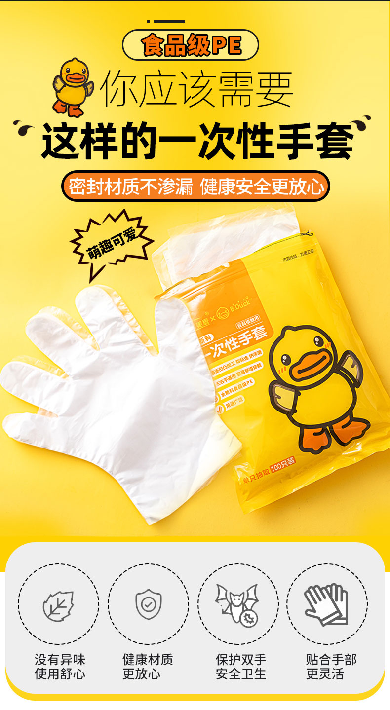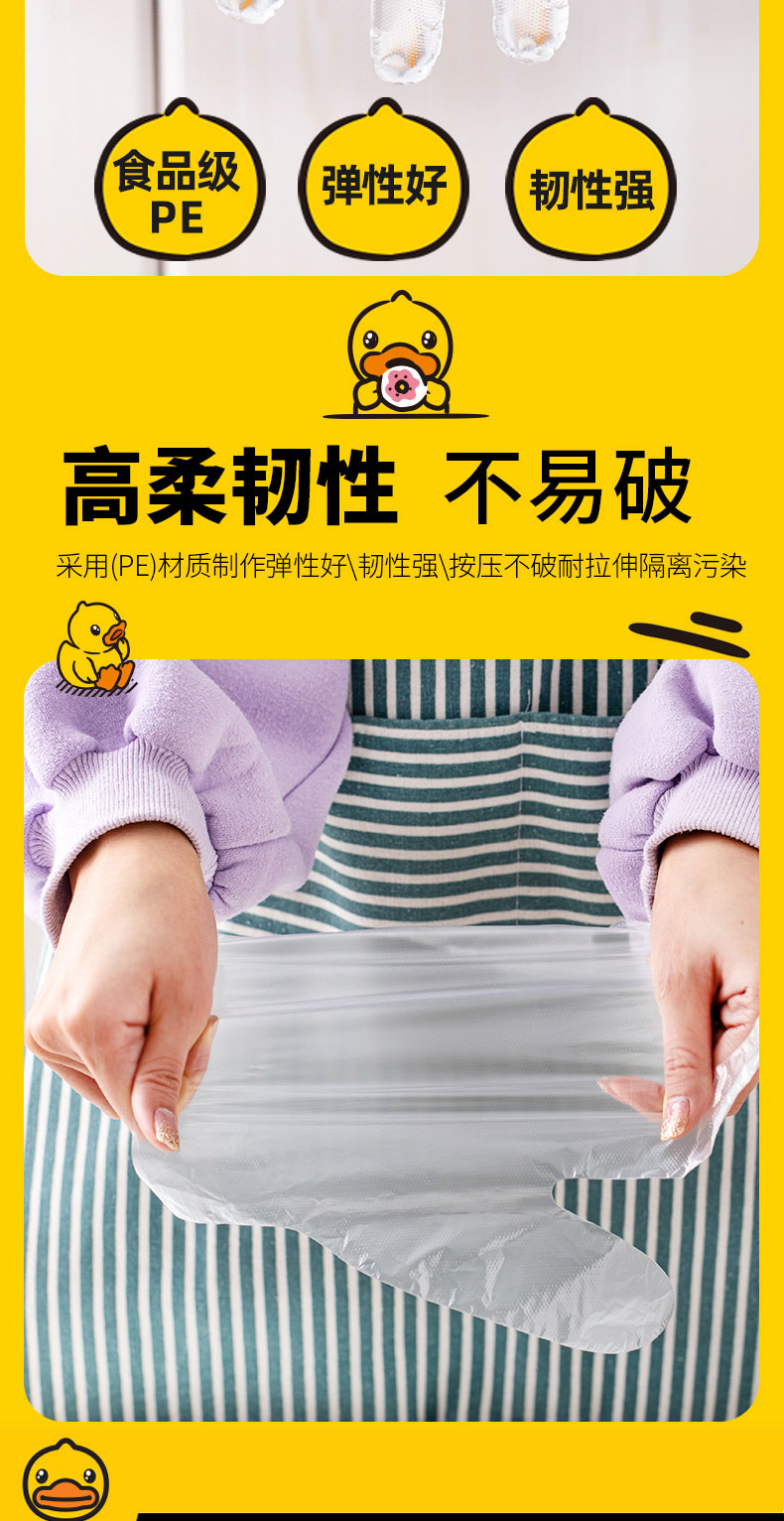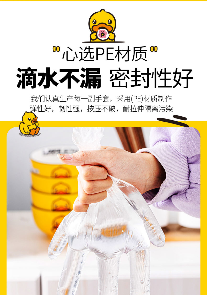 B.Duck小黄鸭一次性手套PE材质加厚防漏卫生手套透明薄膜家用夜宵野餐龙虾手套