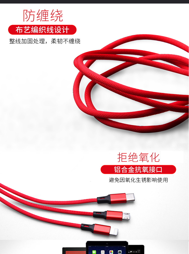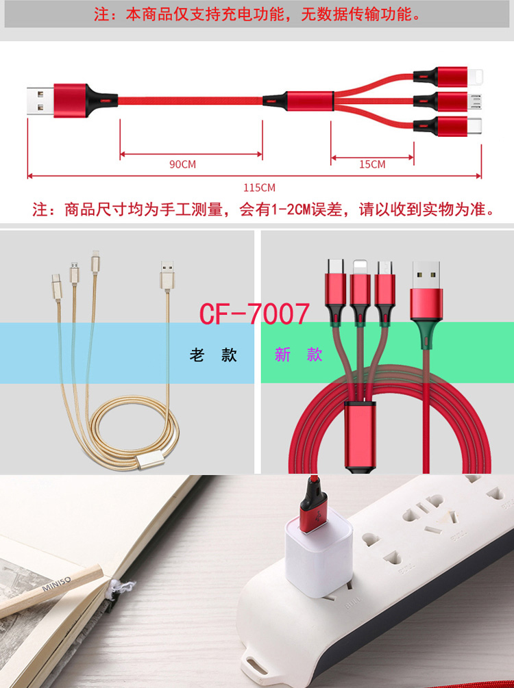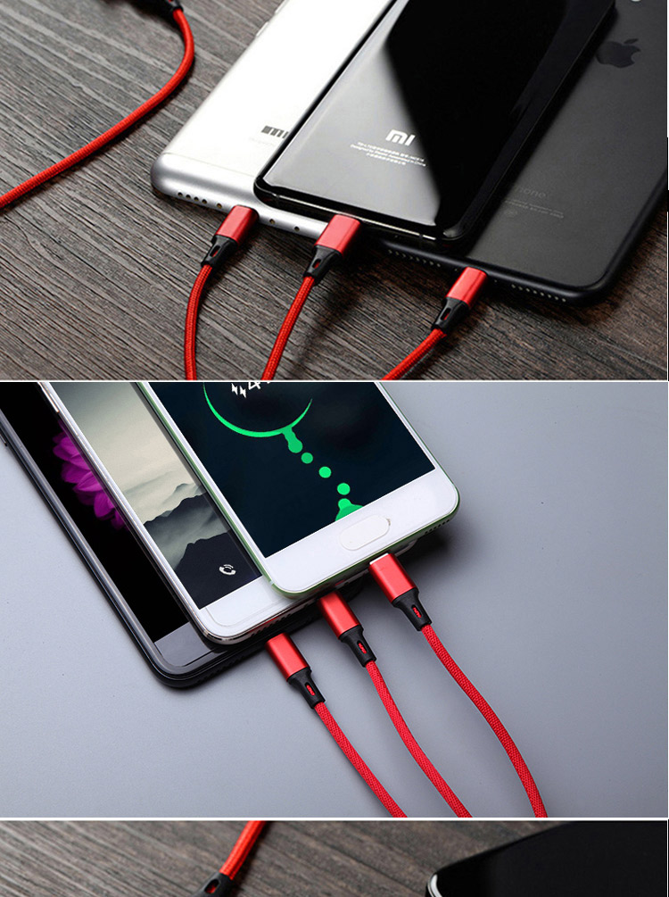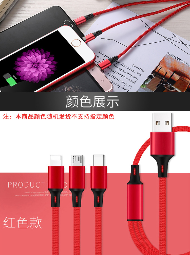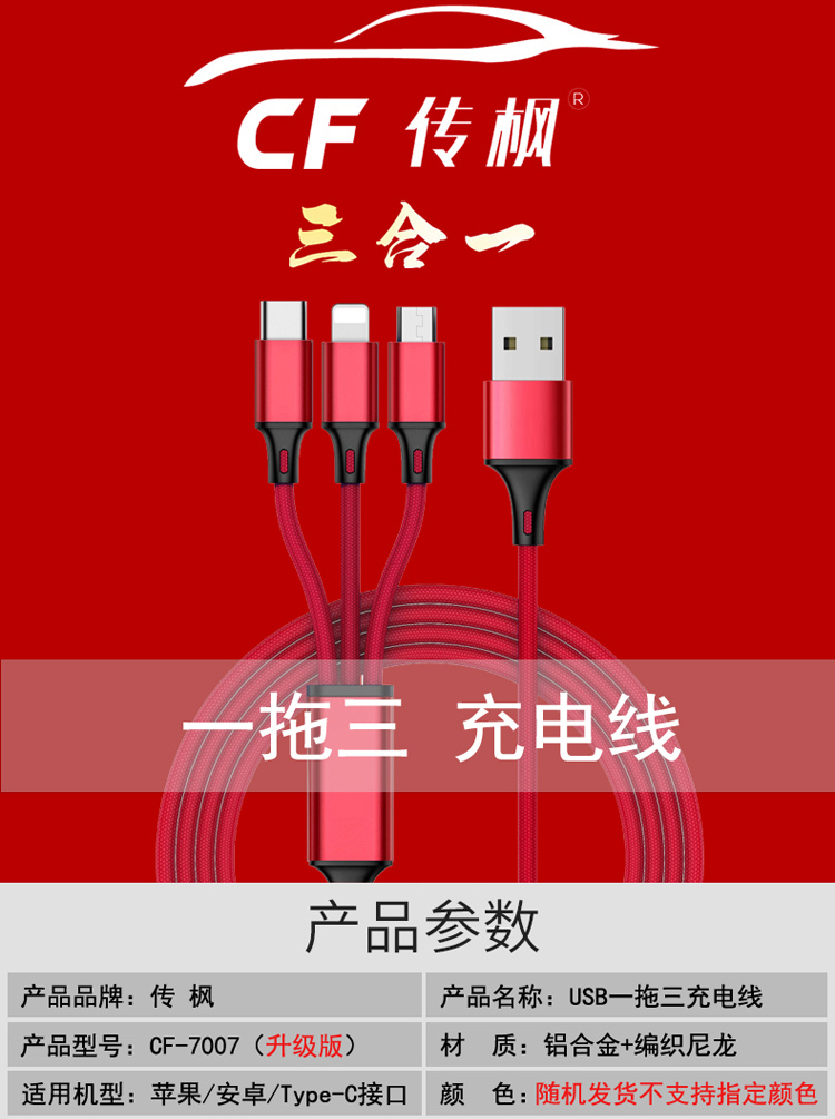 传枫 一拖三 USB充电线 苹果+安卓+Type-c三合一多头手机充电线(颜色随机发货)CF-7007