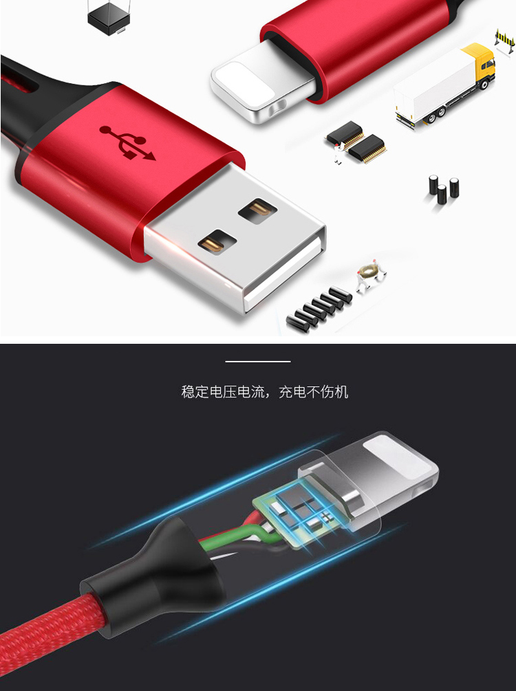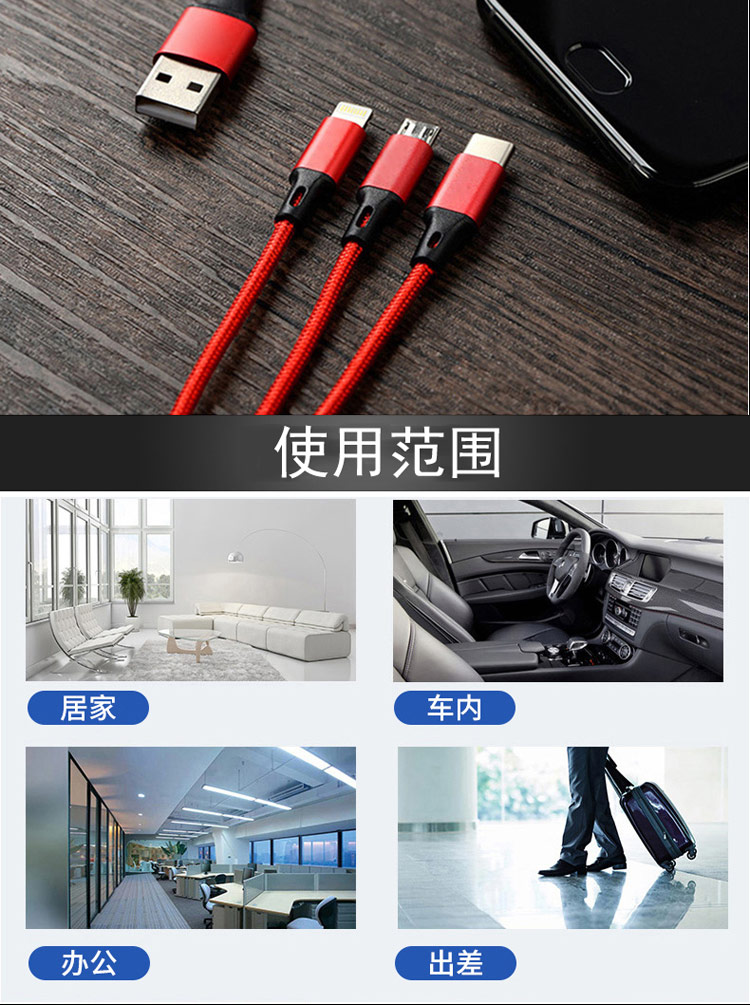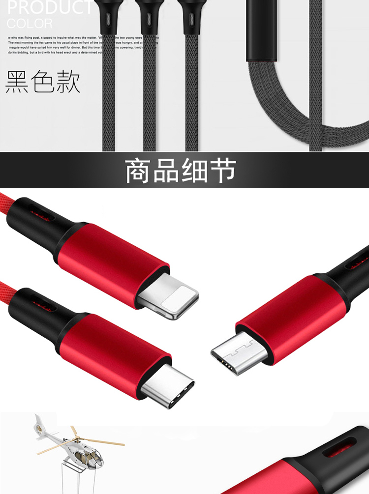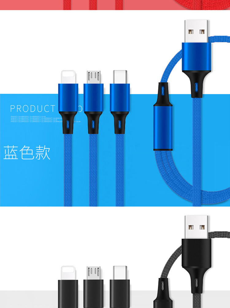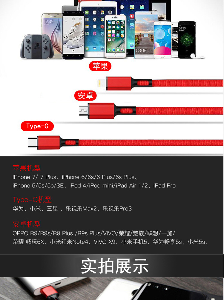 传枫 一拖三 USB充电线 苹果+安卓+Type-c三合一多头手机充电线(颜色随机发货)CF-7007