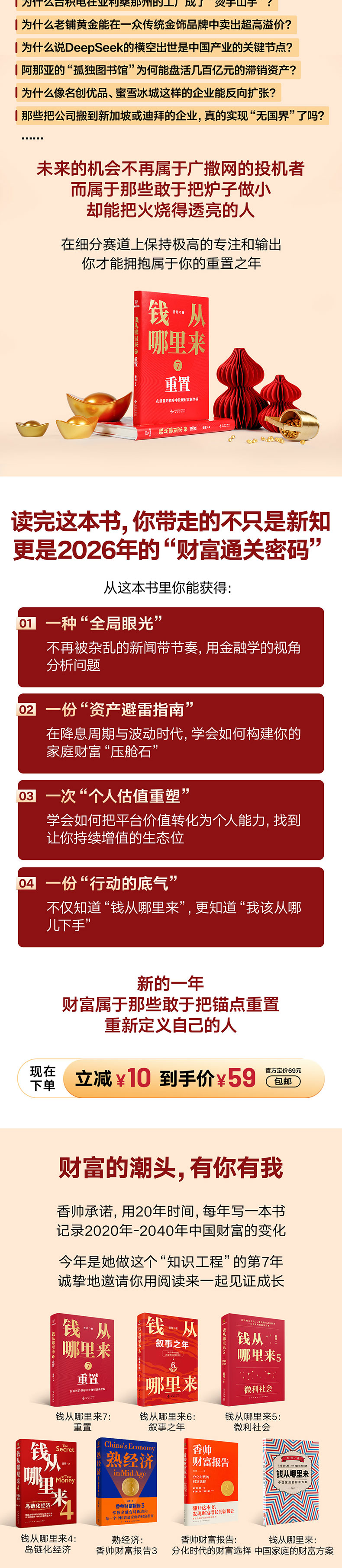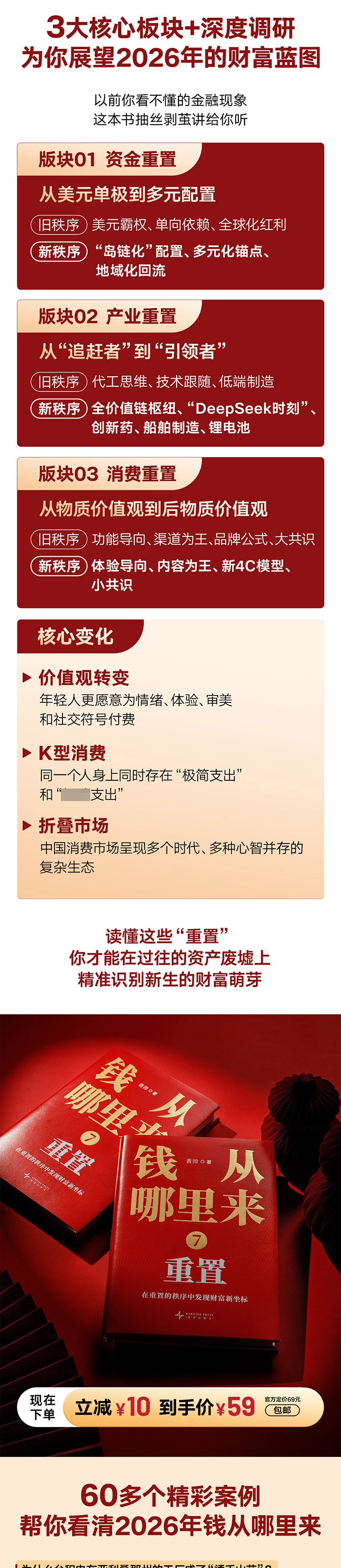 过去三年,整个世界仿佛一直被迷雾笼罩:旧秩序在震荡中悄然撕裂,全球经济在失衡中反复摇摆。2025年,这场漫长的迷雾之旅终于出现转折,全球开始进入“重置”的节奏,新秩序的轮廓逐渐清晰,新财富流向的线索也正在浮出水面。 沿着“重置”这条主线,著名金融学者香帅用一年时间,深入调研了新能源、创新药、船舶制造、智能硬件等重点产业,以及菜鸟、大疆、泡泡玛特、潮宏基、顾家家居等标杆样本企业,研读上百份前沿数据报告,整理超百万字调研资料,试图找到新秩序下财富增长的关键驱动力,帮助企业、家庭及个体在“重置”之中看清方向,抓住财富增长的新机会。 资金重置—— 为什么2025年成为多年未遇的“资产大年”? 全球资金的配置逻辑发生了怎样的变化? 美元资产还值得持有吗?黄金是否值得买入? 叙事主导市场,普通人如何把握投资时机? 产业重置—— 支撑中国产业结构性升级的核心力量是什么......