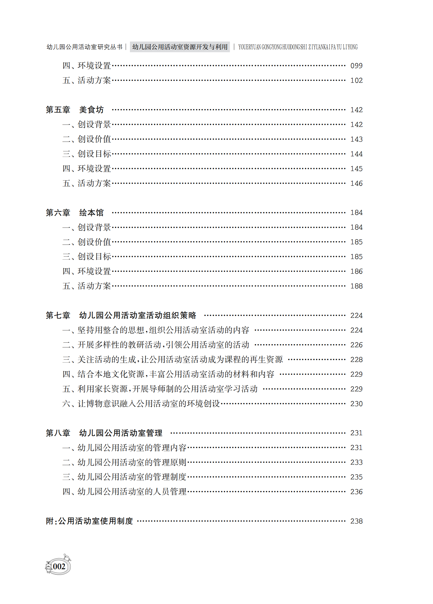 本书是“幼儿园公用活动室研究丛书”的一本,全书结构完整,活动内容实践性强,语言通俗易懂。此书的特出特点是具体阐述了5个公用活动室的创建背景、价值、目标、具体活动方案等。这对于想创建公用活动室的幼儿园有比较广泛的实践参考价值。本书的出版将会给广大幼教工作者及高校学前教育教师、学生等带来参考,具有重要的学习及参考使用价值。