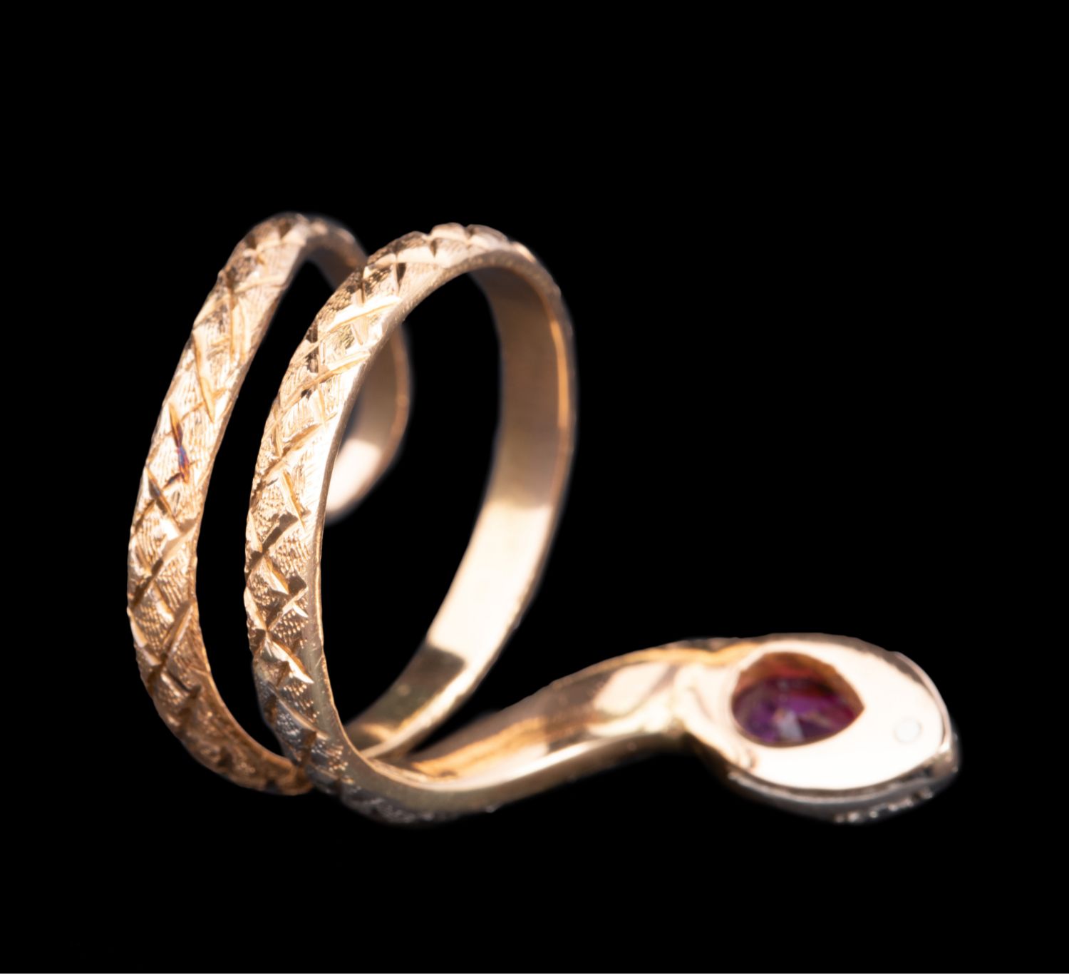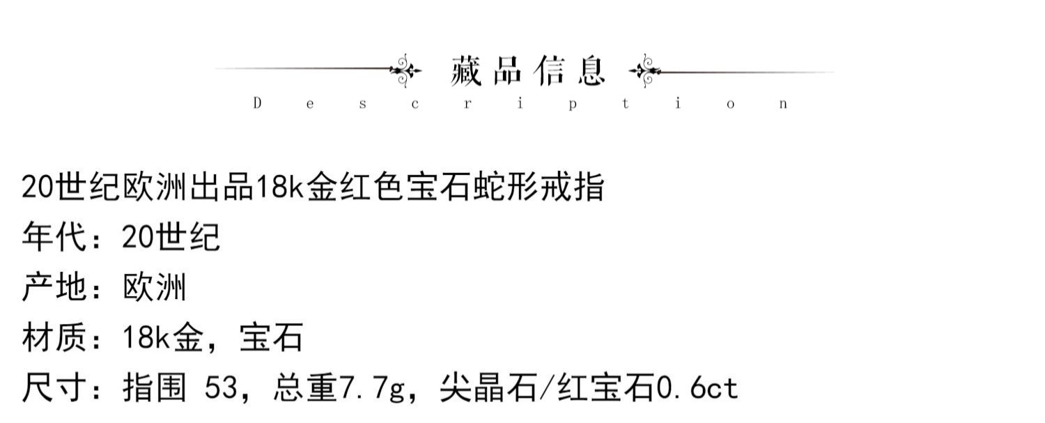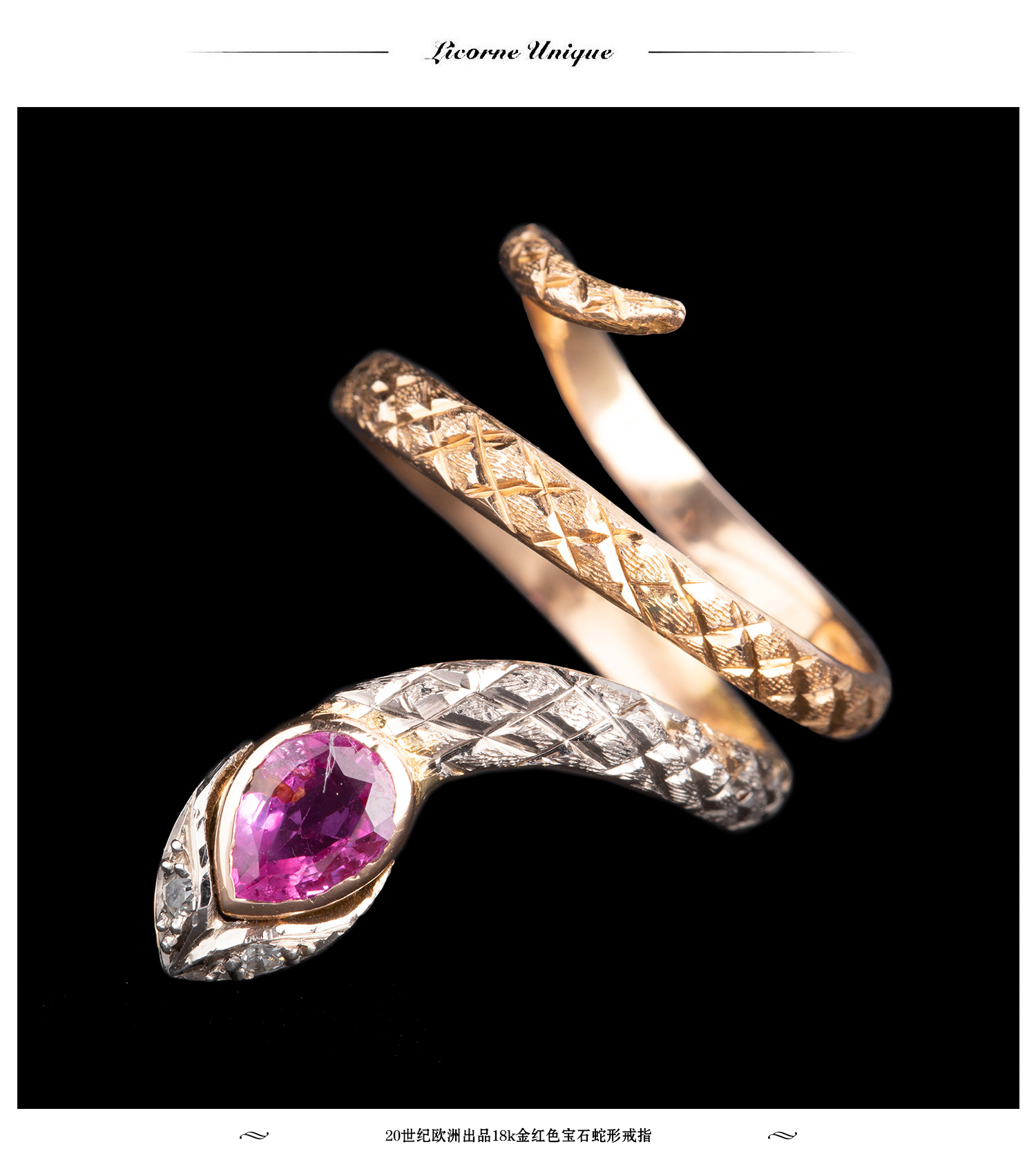 独角鹿西洋古董珠宝首饰20世纪欧洲出品18k金红色宝石蛇形戒指