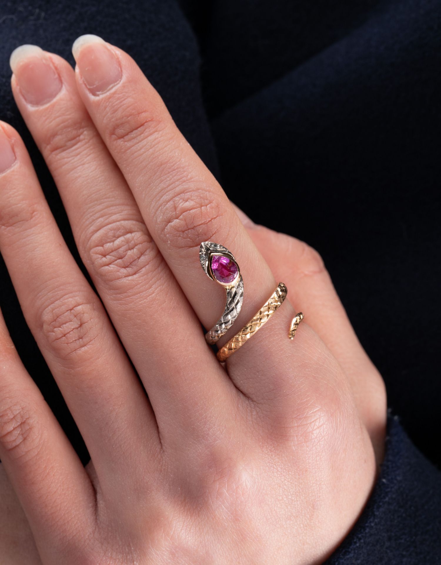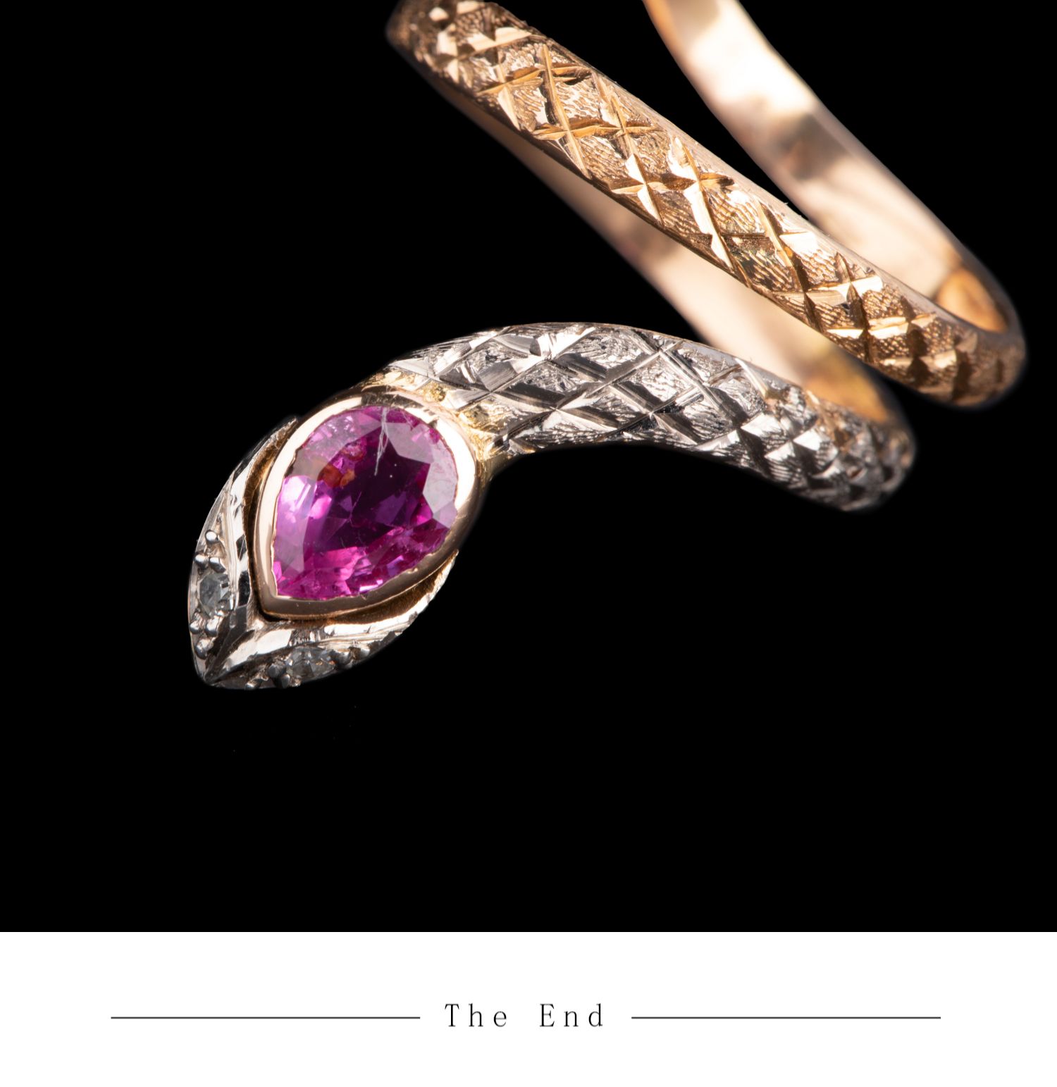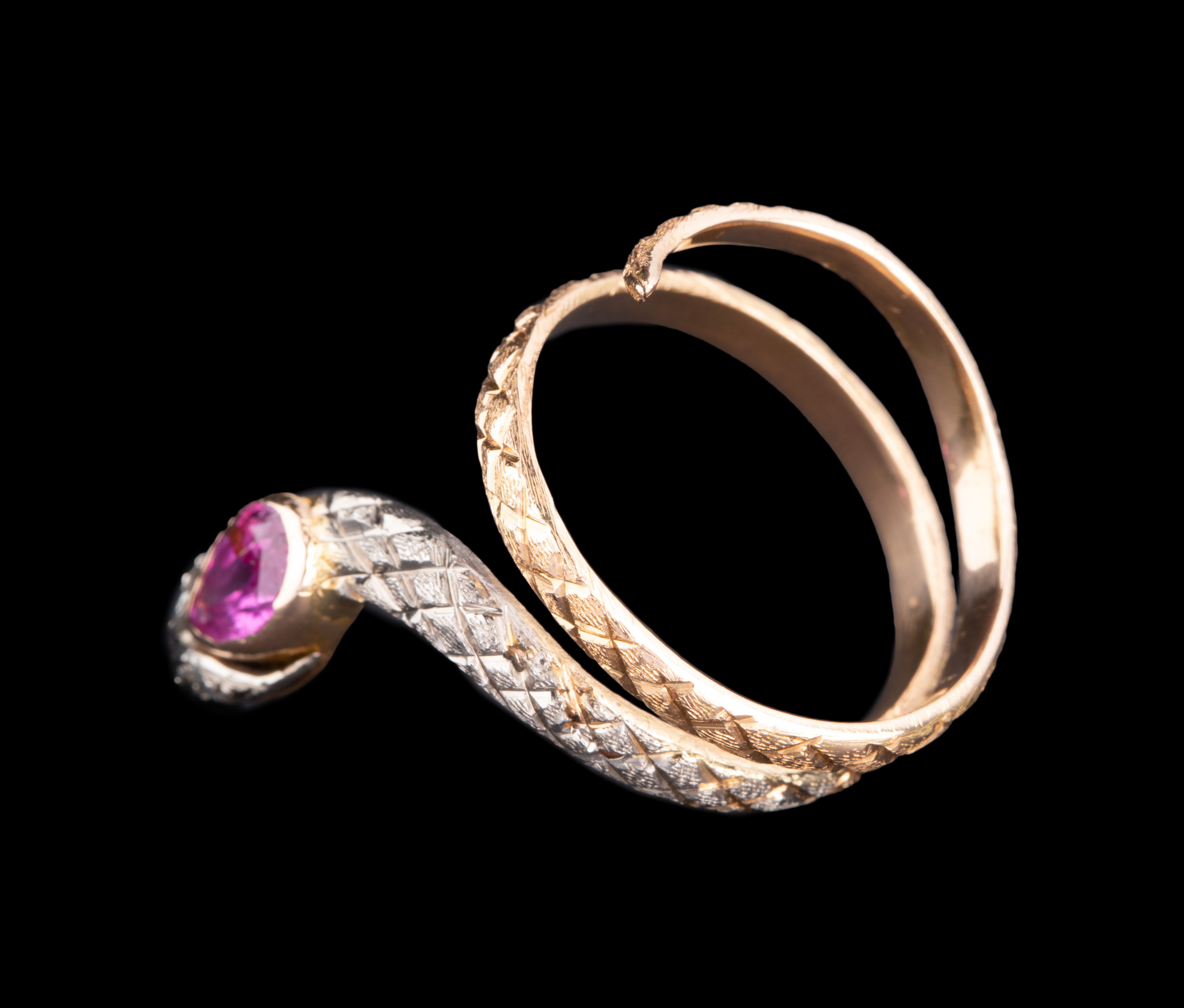 独角鹿西洋古董珠宝首饰20世纪欧洲出品18k金红色宝石蛇形戒指