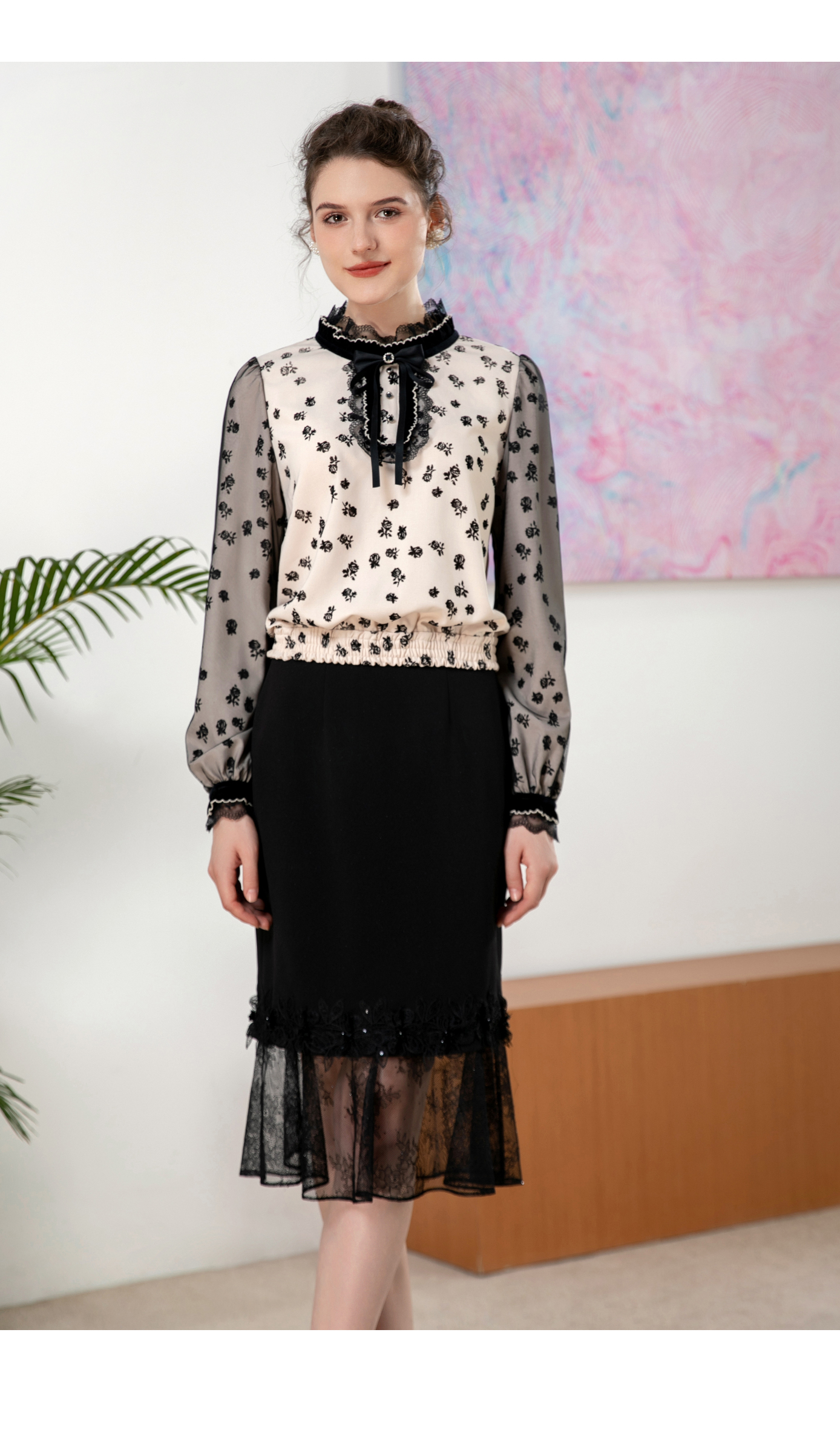 司歌印花收腰长袖雪纺上衣秋冬T921160X