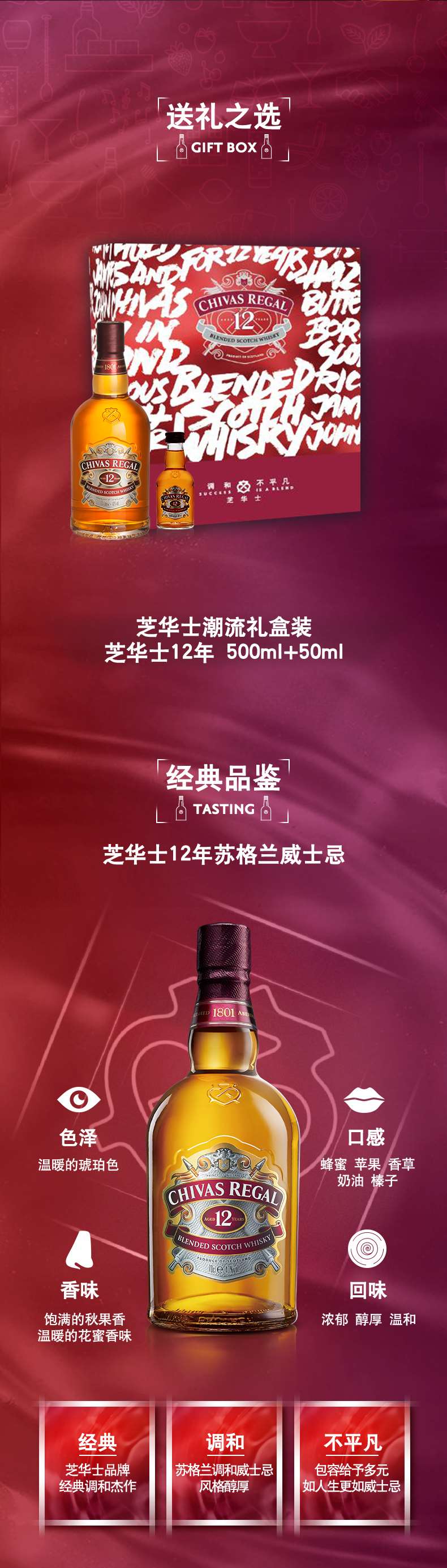 芝华士12年苏格兰调和威士忌 500ml+50ml 礼盒送 礼定制