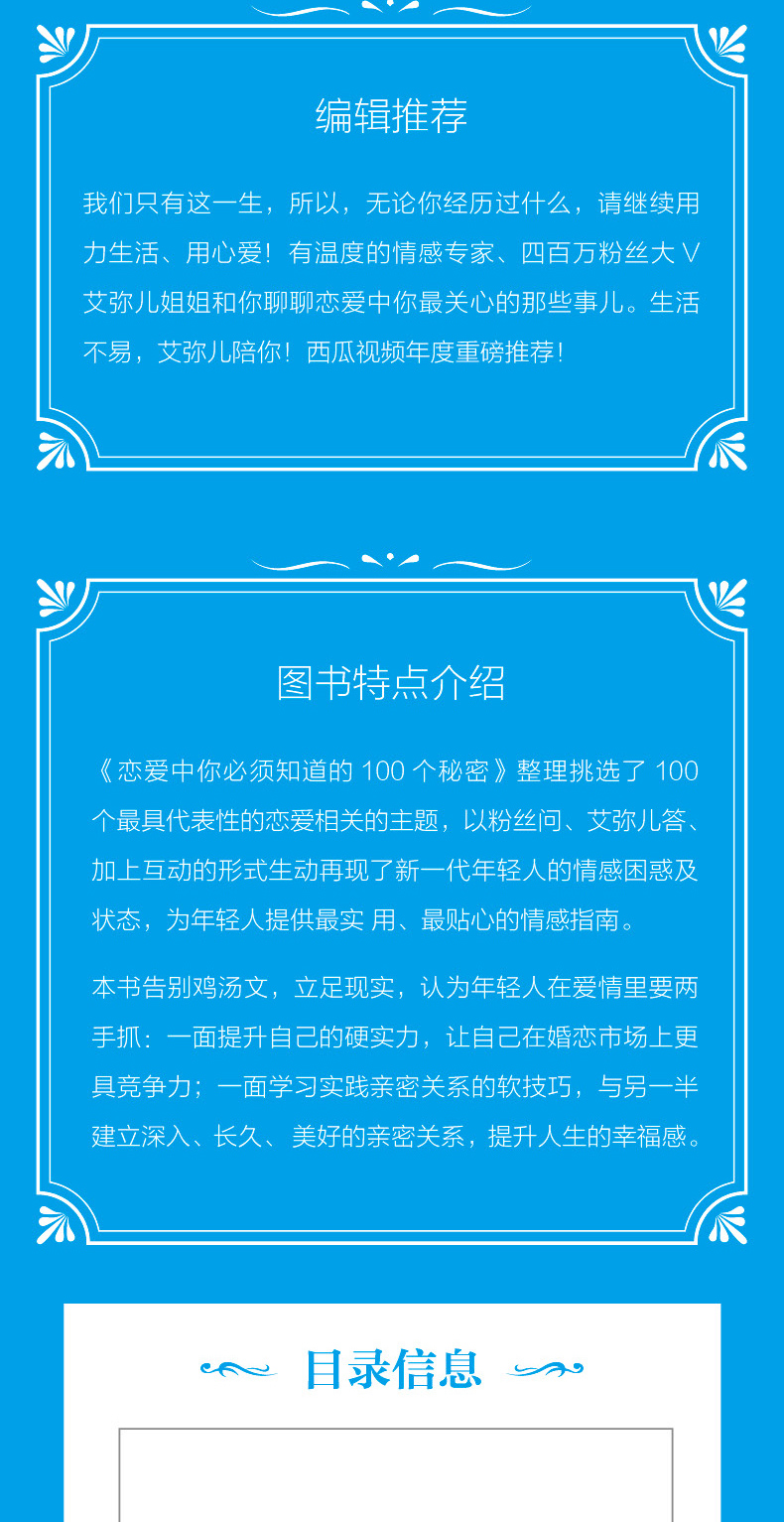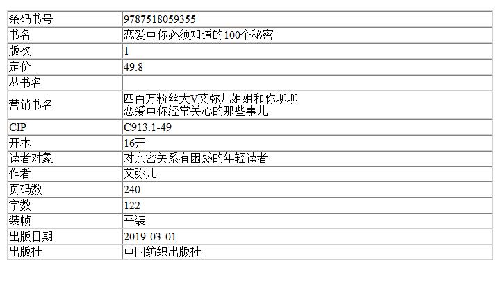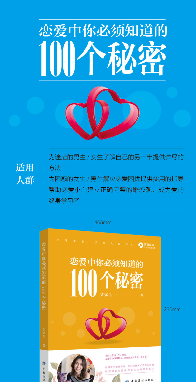 ⊕《恋爱中你必须知道的100个秘密》整理挑选了100个最具代表性的恋爱相关的主题,以粉丝问、艾弥儿答、加上互动的形式生动再现了新一代年轻人的情感困惑及状态,为年轻人提供最实 用、最贴心的情感指南。