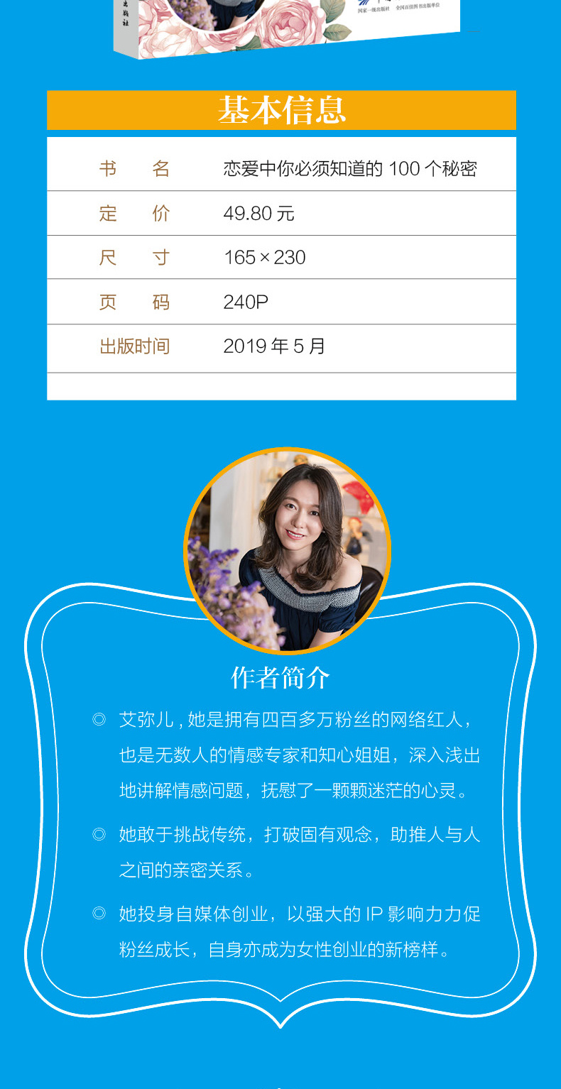 内容简介“性格内向的男生如何跟女朋友聊天呢?”“异地恋到 底要不要继续呢?”“两个人在恋爱期间要不要AA制呢?” 情感类节目《艾弥儿》自播出以来,每天在后台以及直播间 里会收到来自粉丝的数百个情感问题及困惑,本书《恋爱中你必须知道的100个秘密》整理挑选了100个最具代表性的恋 爱相关的主题,以粉丝问、艾弥儿答、加上互动的形式生动 再现了新一代年轻人的情感困惑及状态,为年轻人提供最实用、最贴心的情感指南。