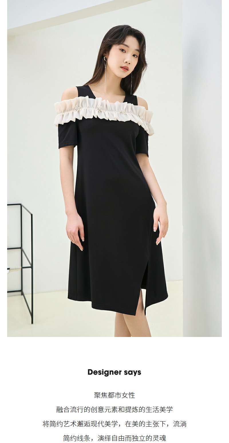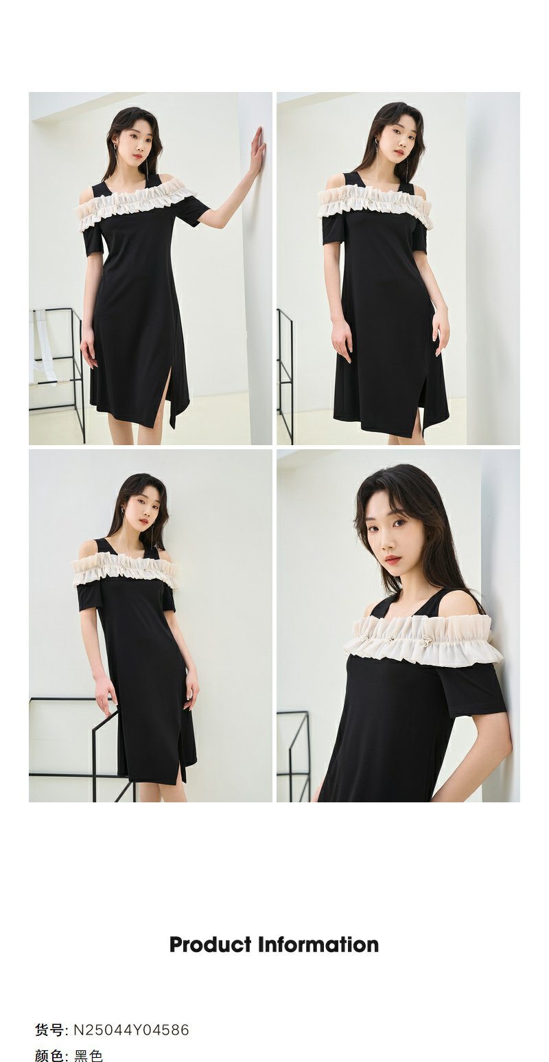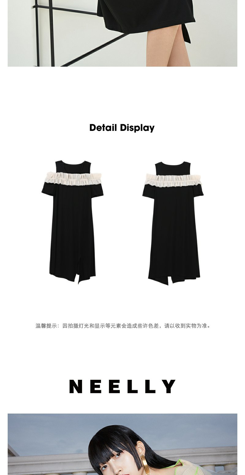NEELLY纳俪商场同款夏季新款黑色法式露肩设计感连衣裙女显瘦长裙N25044Y04586