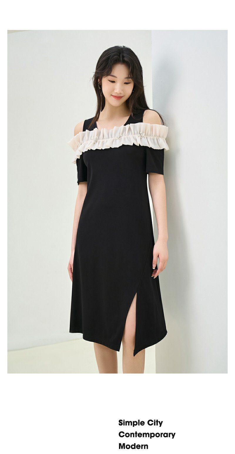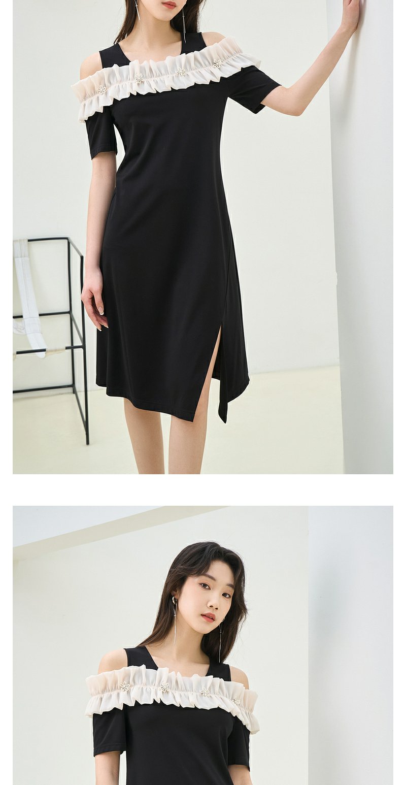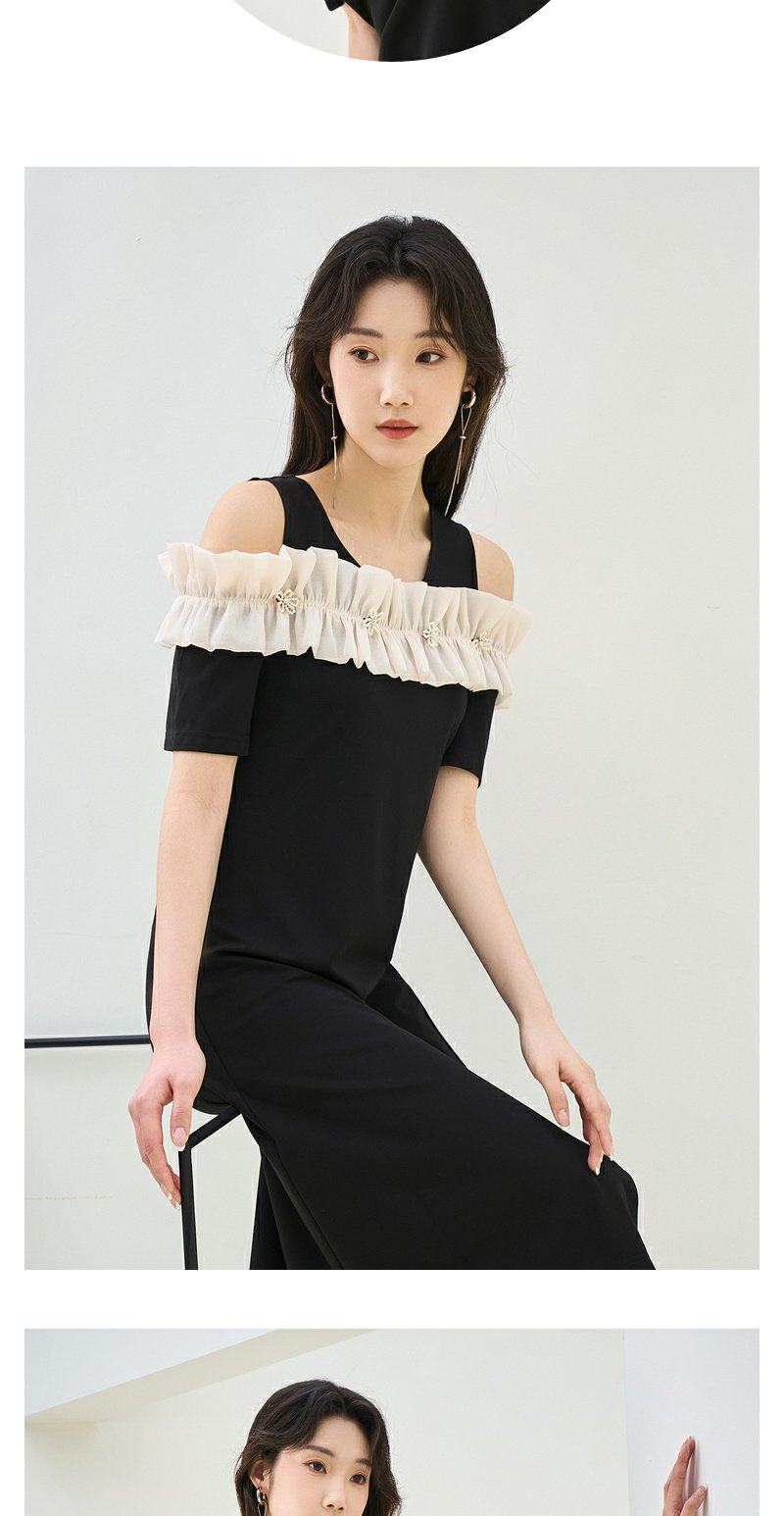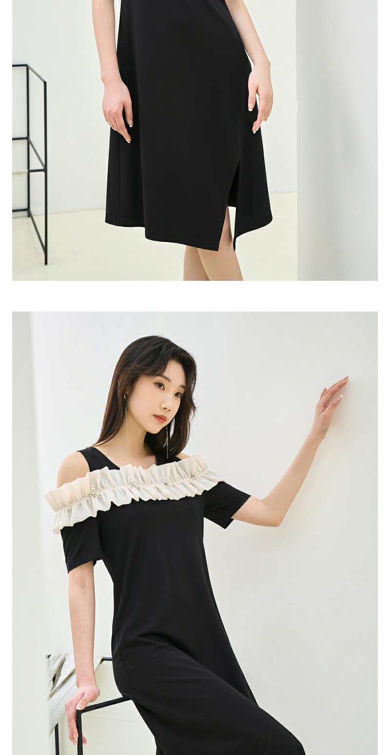 NEELLY纳俪商场同款夏季新款黑色法式露肩设计感连衣裙女显瘦长裙N25044Y04586