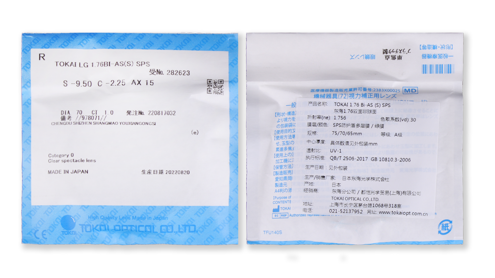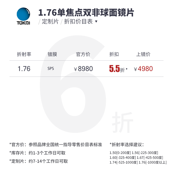 日本 1.76 东海TOKAI 双非球面超薄镜片