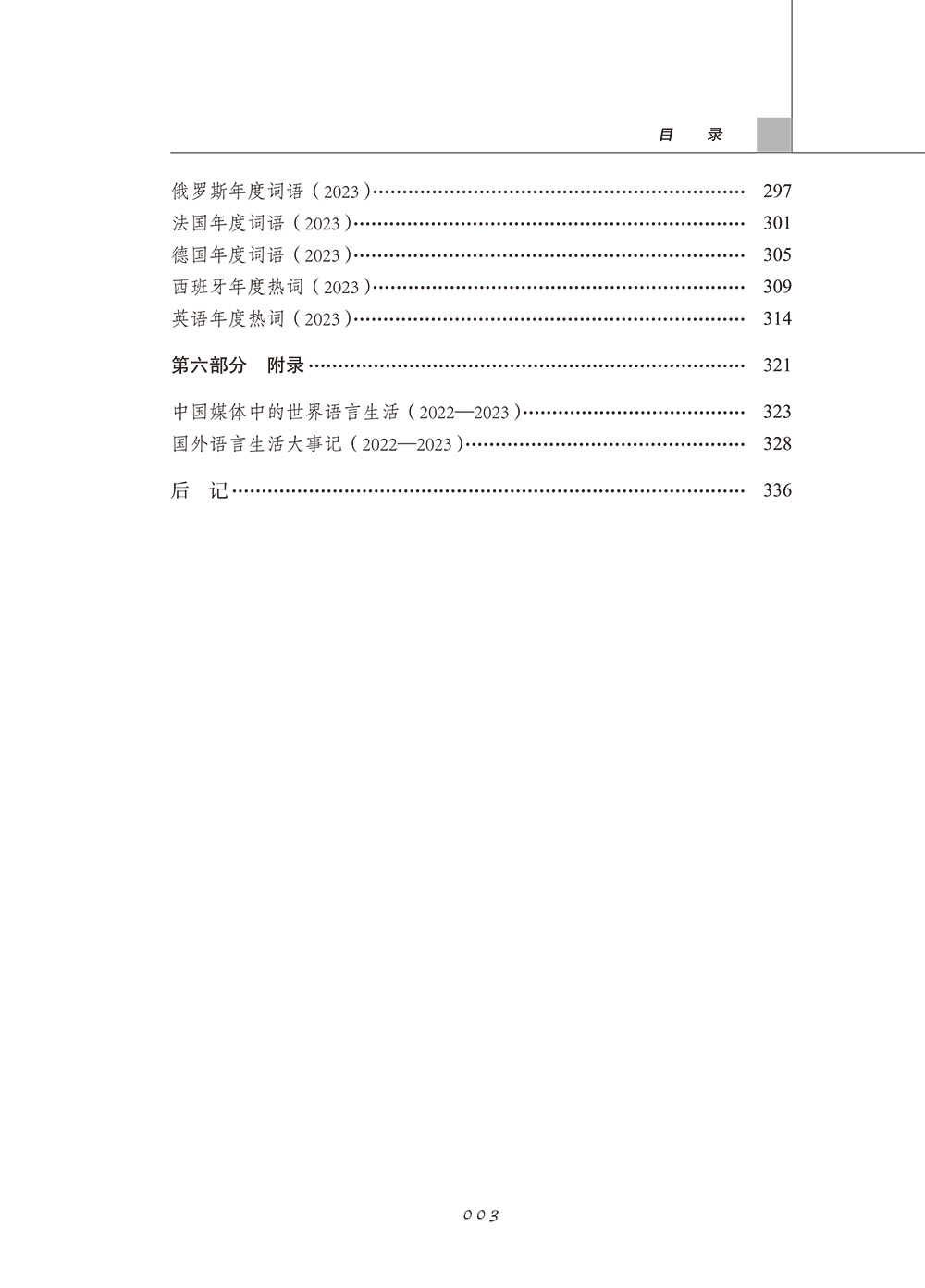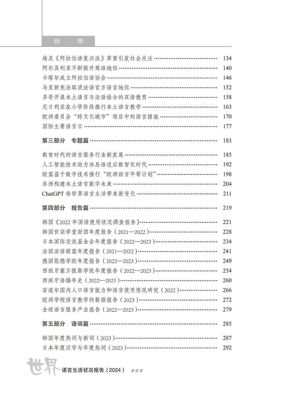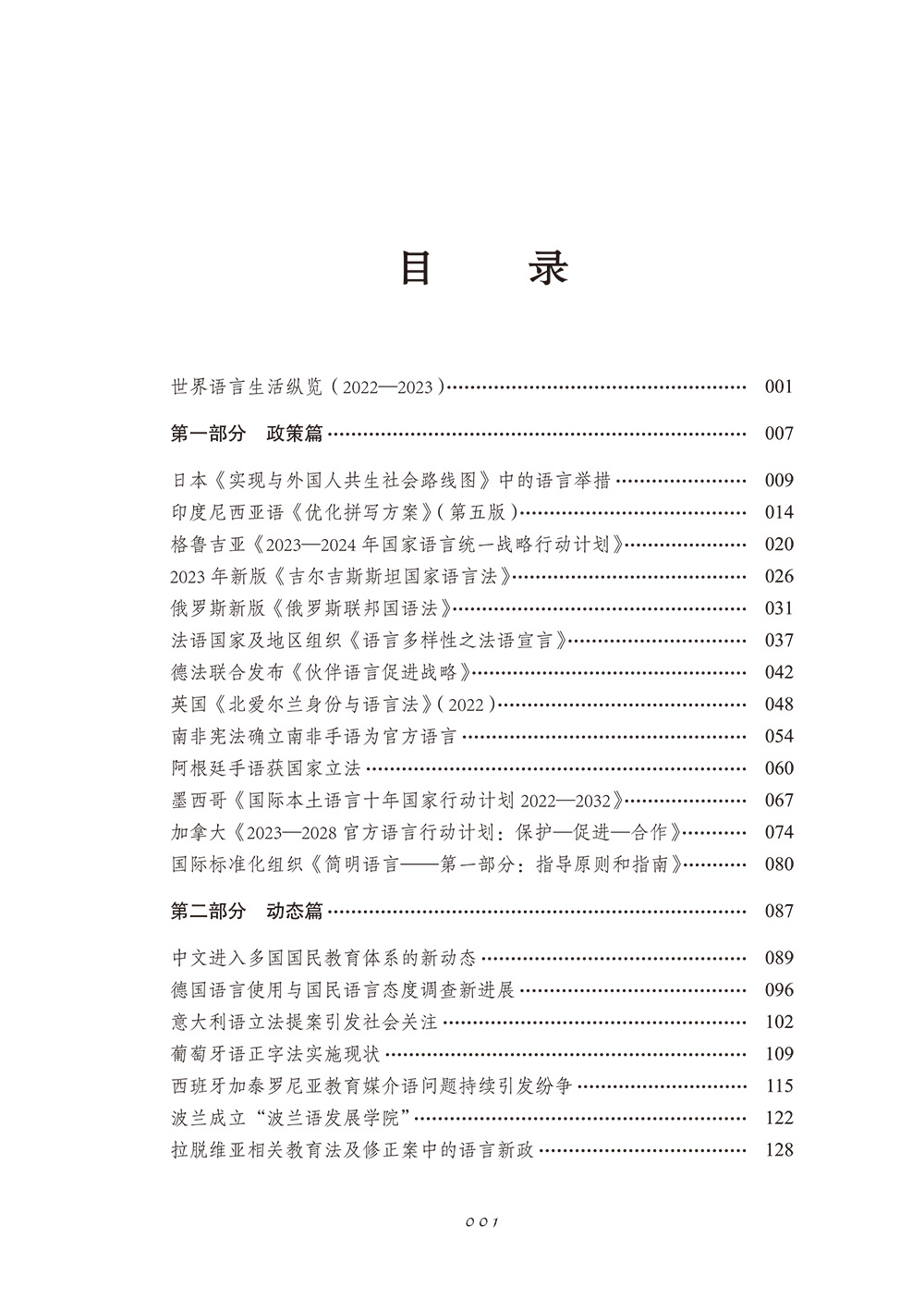 本报告是国家语委中国外语战略研究中心组织编写,是中国学者观察和分析世界语言生活的研究报告。本书的观察时段为2022—2023年。第一部分“政策篇”,针对明确发布的政策措施,每篇报告都围绕着一个核心政策文本展开叙述;第二部分“动态篇”,重点呈现语言生活中的新趋势和新发展,特别关注那些展现变化、启示未来的内容;第三部分“专题篇”,聚焦当年的语言生活专题;第四部分“报告篇”包括重要语言传播机构的年度报告,还有几部重要的阶段性专题报告;第五部分“语词篇”,继以往关注到的韩国、日本、俄罗斯等国家语言年度词语报告;第六部分“附录”给读者提供中国媒体有关世界语言生活文章及国外语言生活大事记。