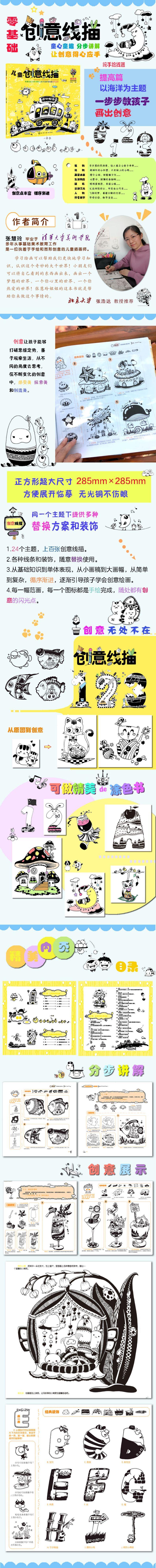 儿童创意线描不仅用了拟人的方法,还包含了夸张、替换、同构、量化等创意方法,用孩子能够接受的方式和方法进行表达,让孩子敢于动笔,更快、更好地学会画创意线描。 每种创意方法,都搭配以详细生动的作画步骤和讲解,逐步激发孩子的动手能力、动脑能力,从而使孩子能主动地画出新颖、有创造力的线描画。 各种线条和装饰,可以随意替换使用,让创意线描更加容易上手。